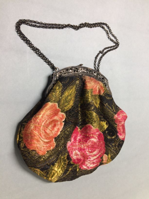 Ajour zilveren tasbeugel met tas van nieuw goudbrokaat aan ketting