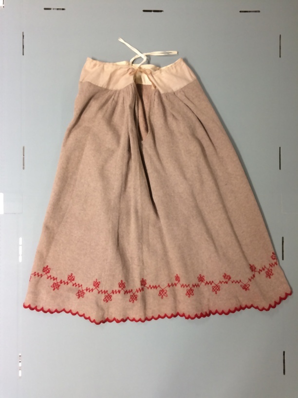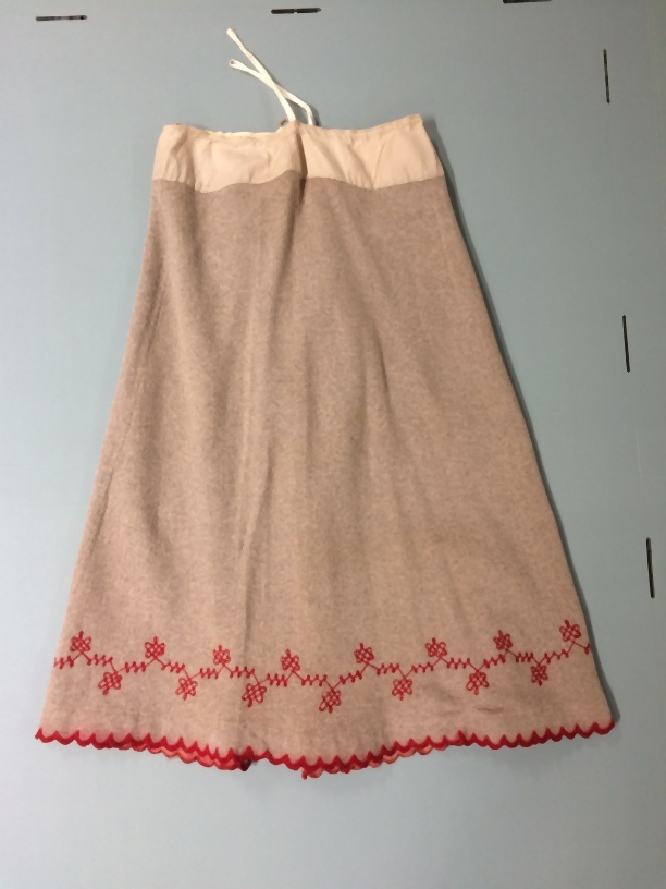 Onderrok van grijs wollen tricot met rode geschulpte zoom en getamboereerd randje