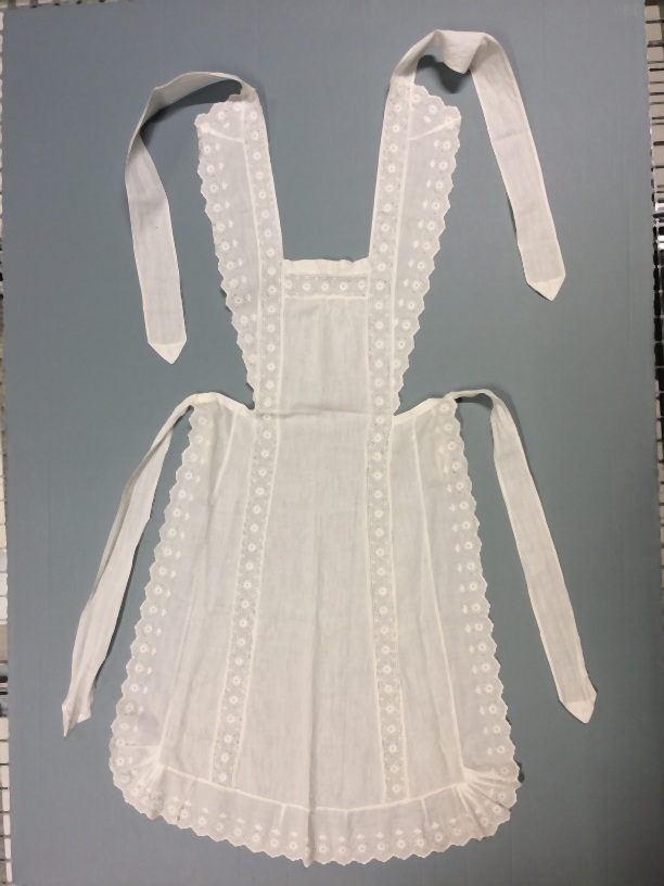 Dienstbodeschort met bovenstuk van gestreept wit katoen met broderie