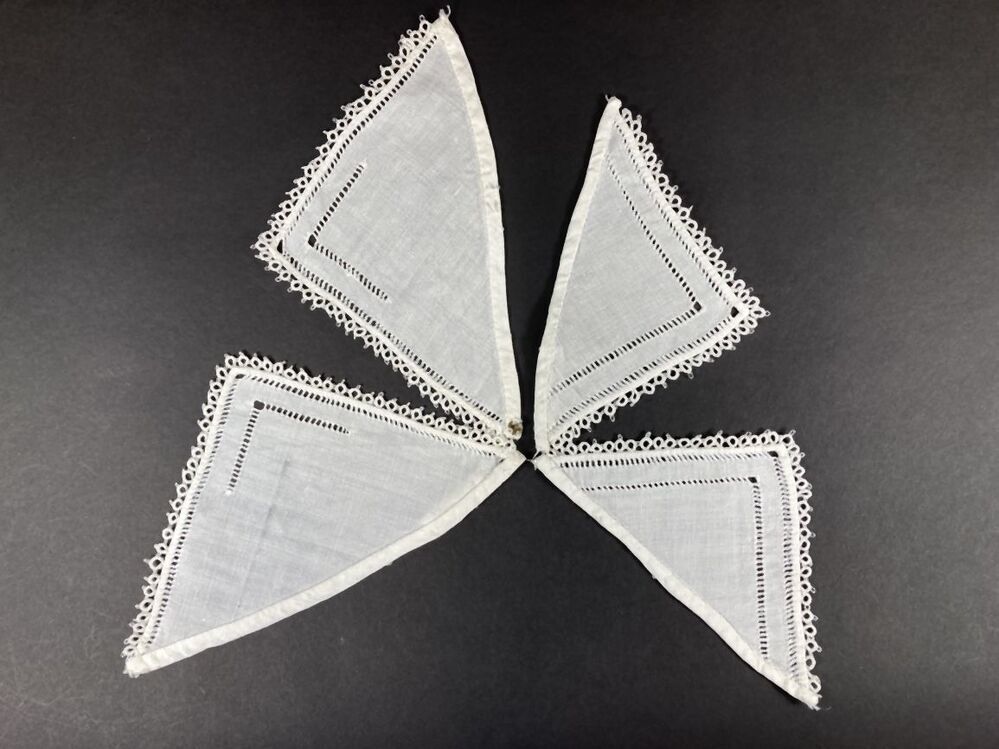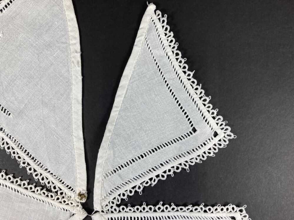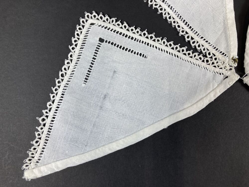Twee linnen kraagpuntjes met bijpassende zakklepjes, open naadjes en afgezet met een frivolitérandje