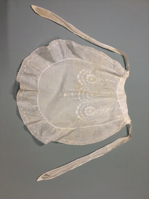Wit batisten theeschortje met centraal geborduurd motief met drie druppelvormen met florale guirlandes