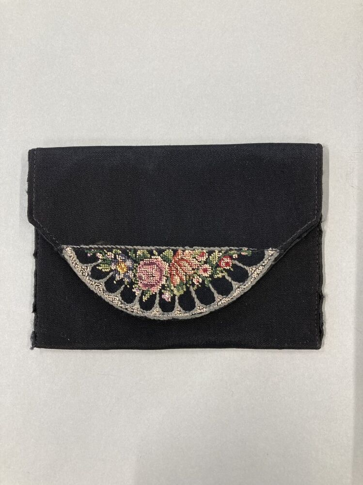 Zwart beursje van kunstzijde met fijn geborduurd floraal patroon op klep