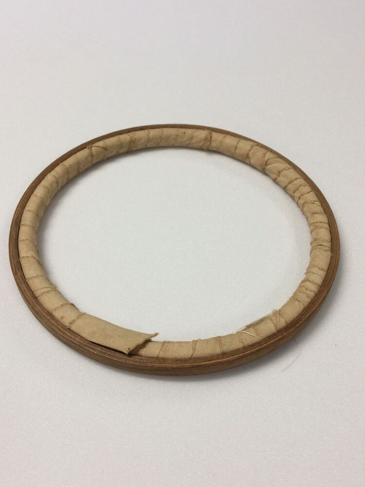 Houten borduurring, twee strak inelkaar passende ringen, de binnenste omwikkeld met een strook katoen