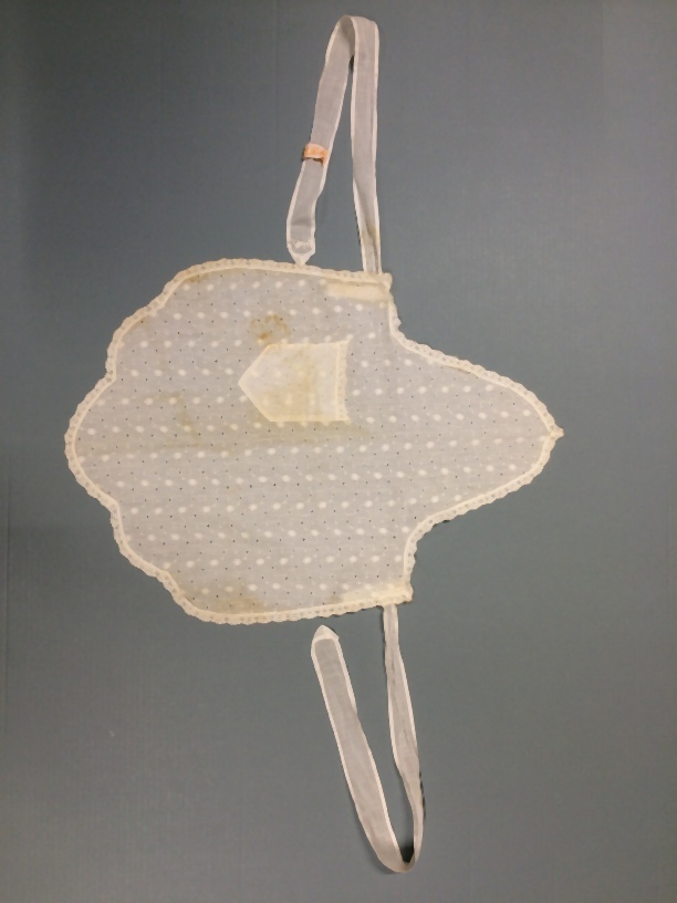 Katoenen schortje, zogenaamd 'evaatje', met aangeknipt bovenstukje en rechtsvoor een opgezet zakje