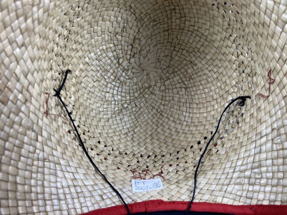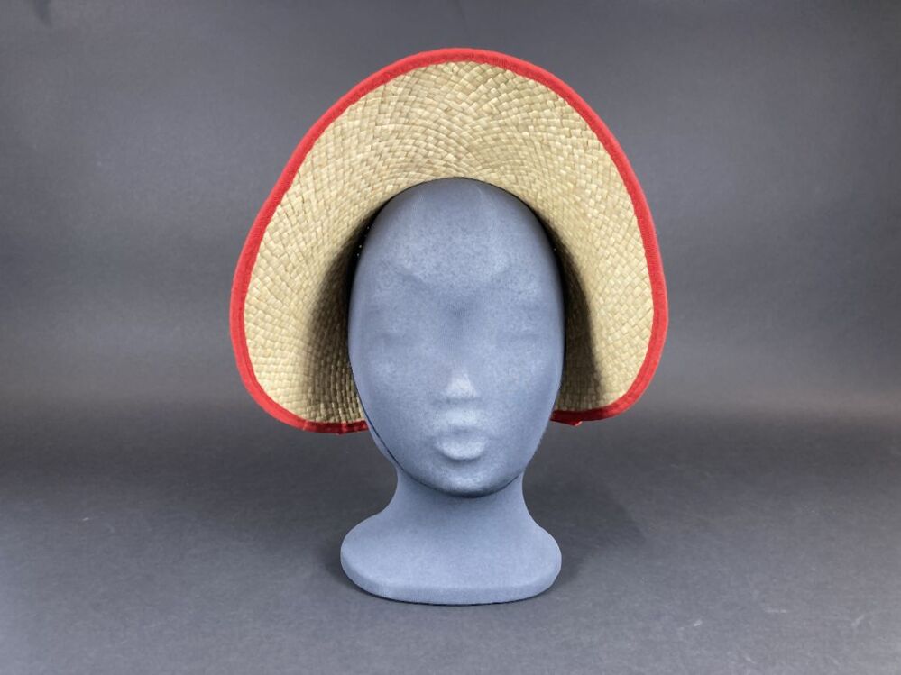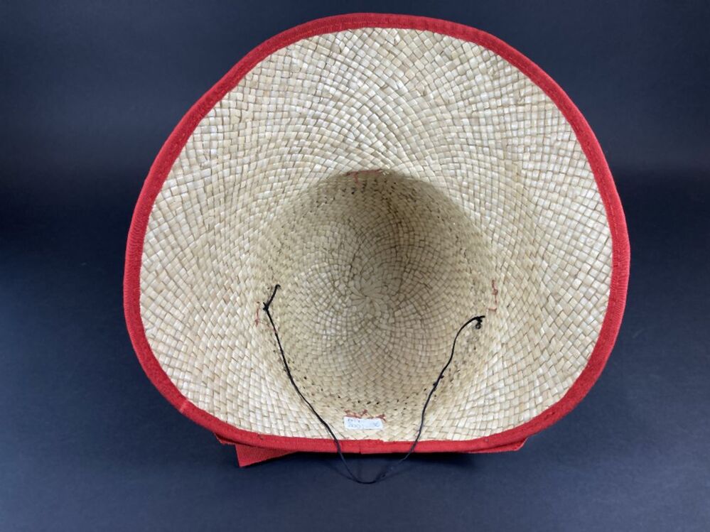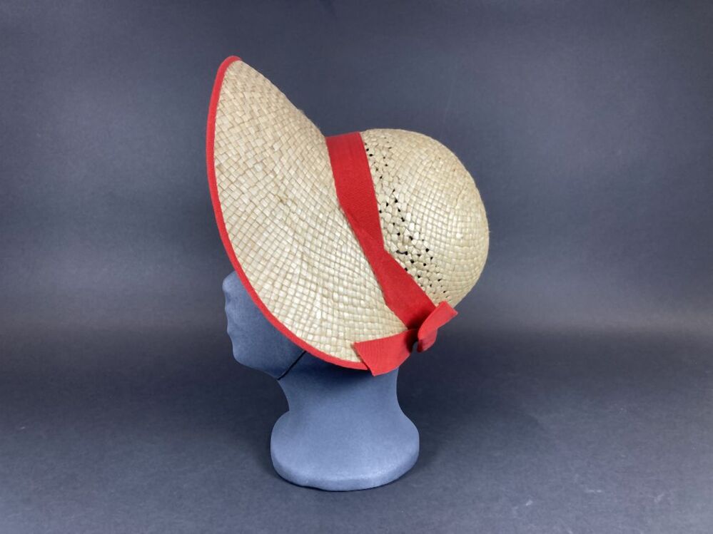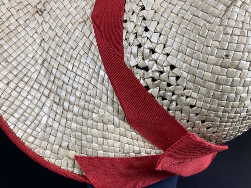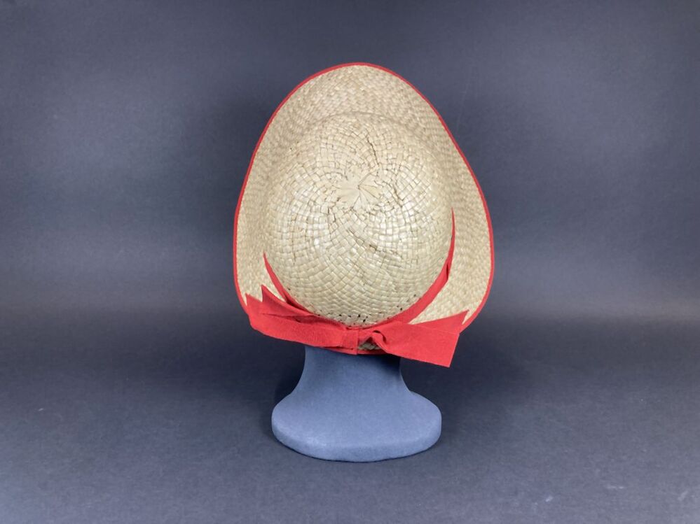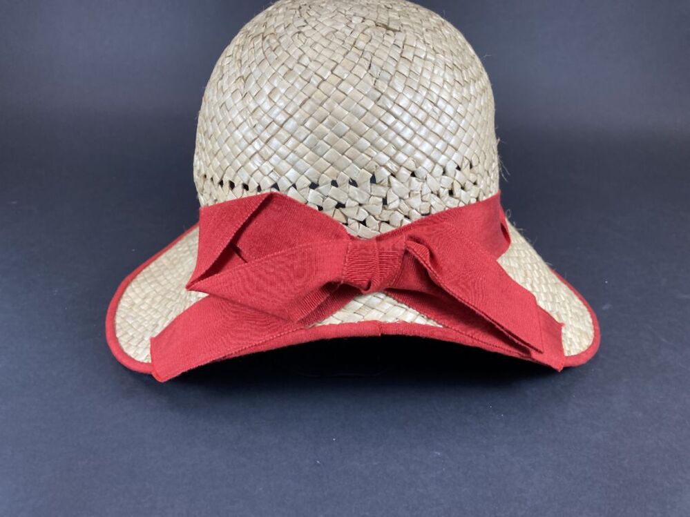 Kinderluifelhoedje van gevlochten stro afgewerkt met rood ribsband
