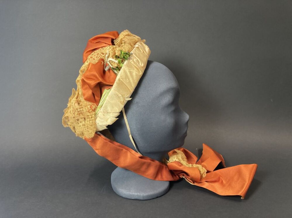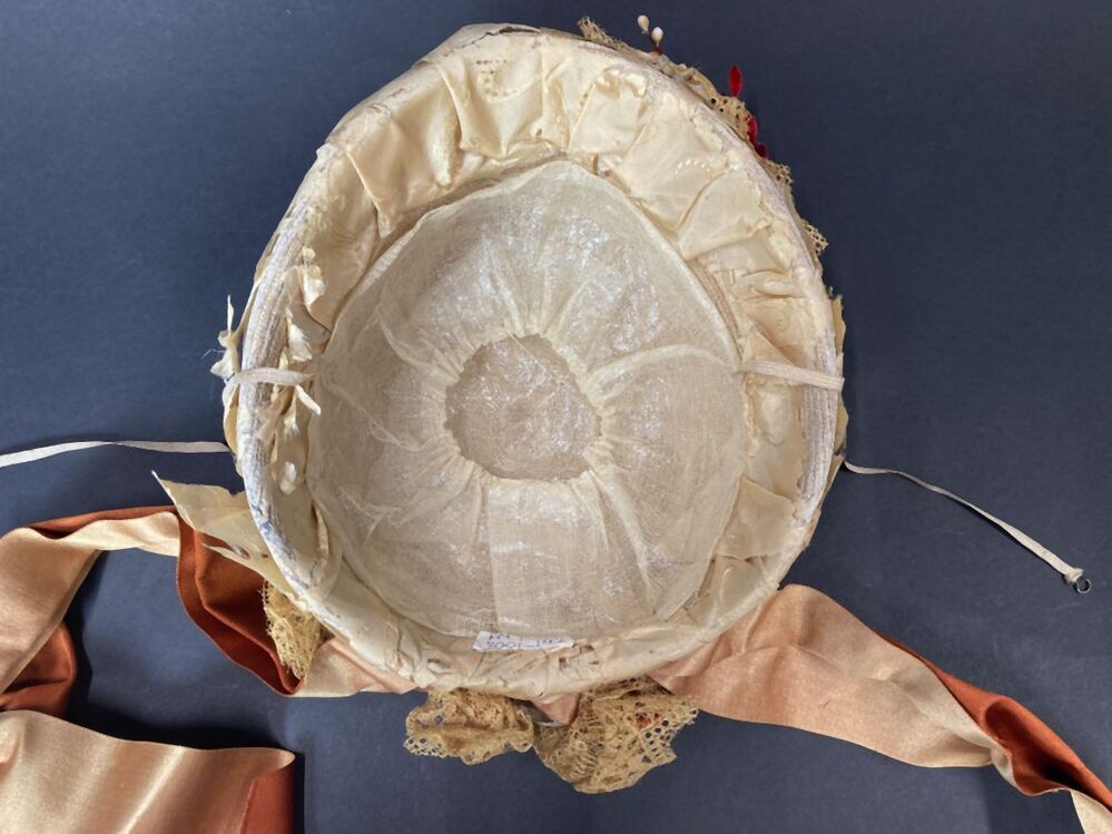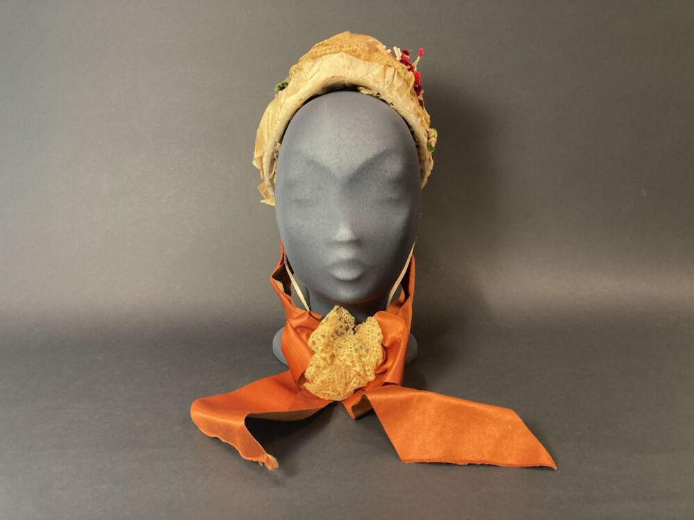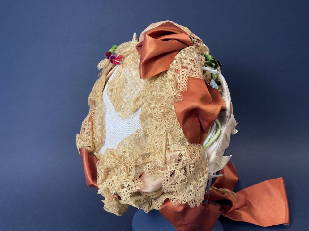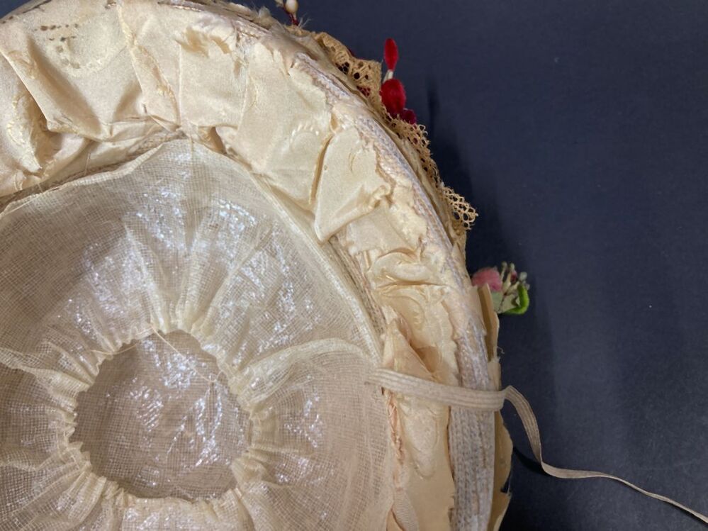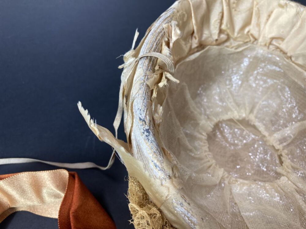 Witte strohoed, toque met cognackleurig lint en beige kant met kunstbloemen en zijden rand