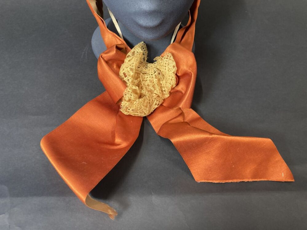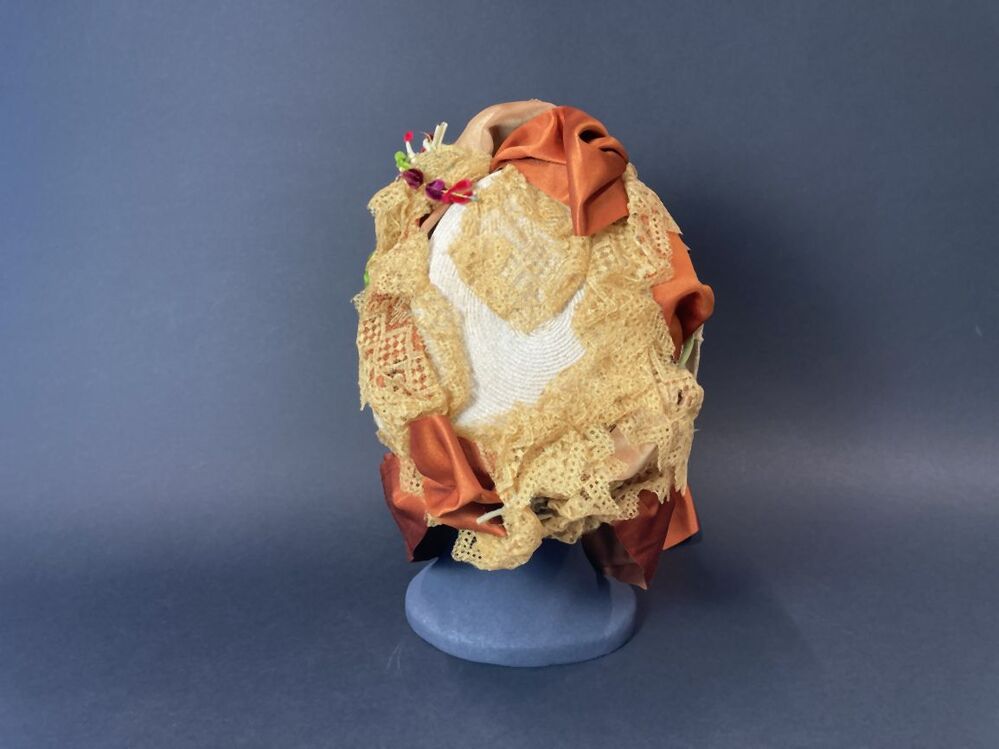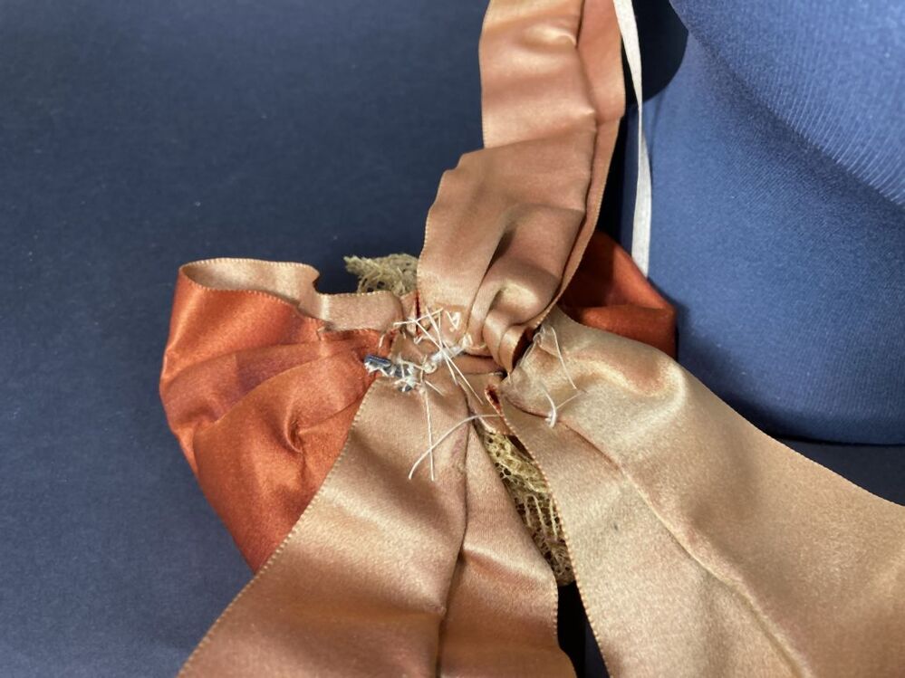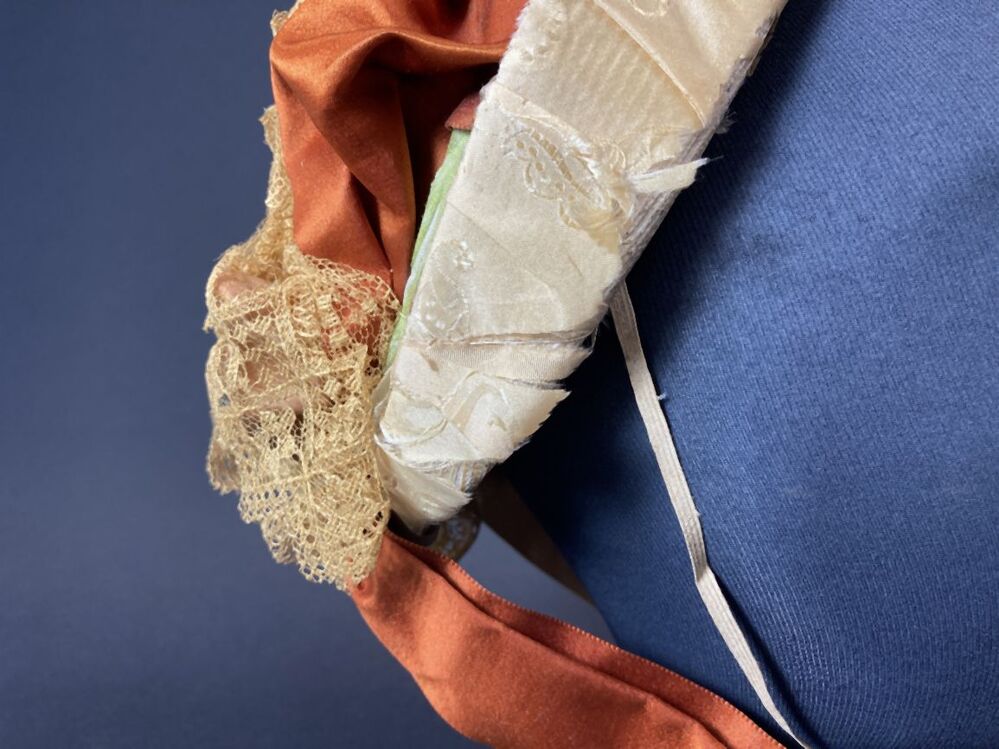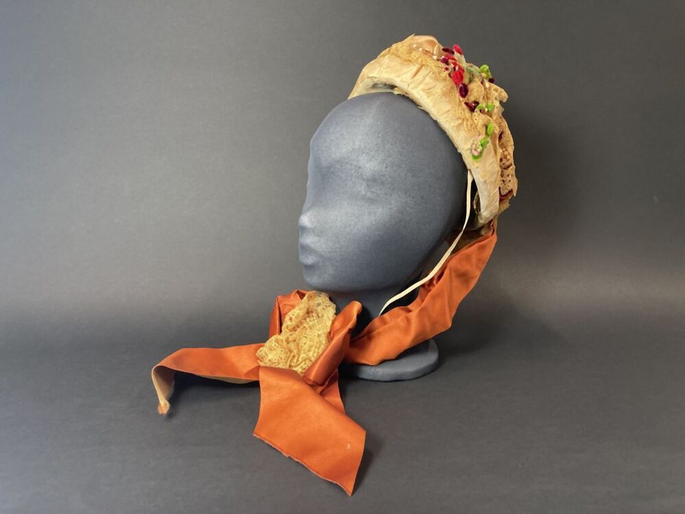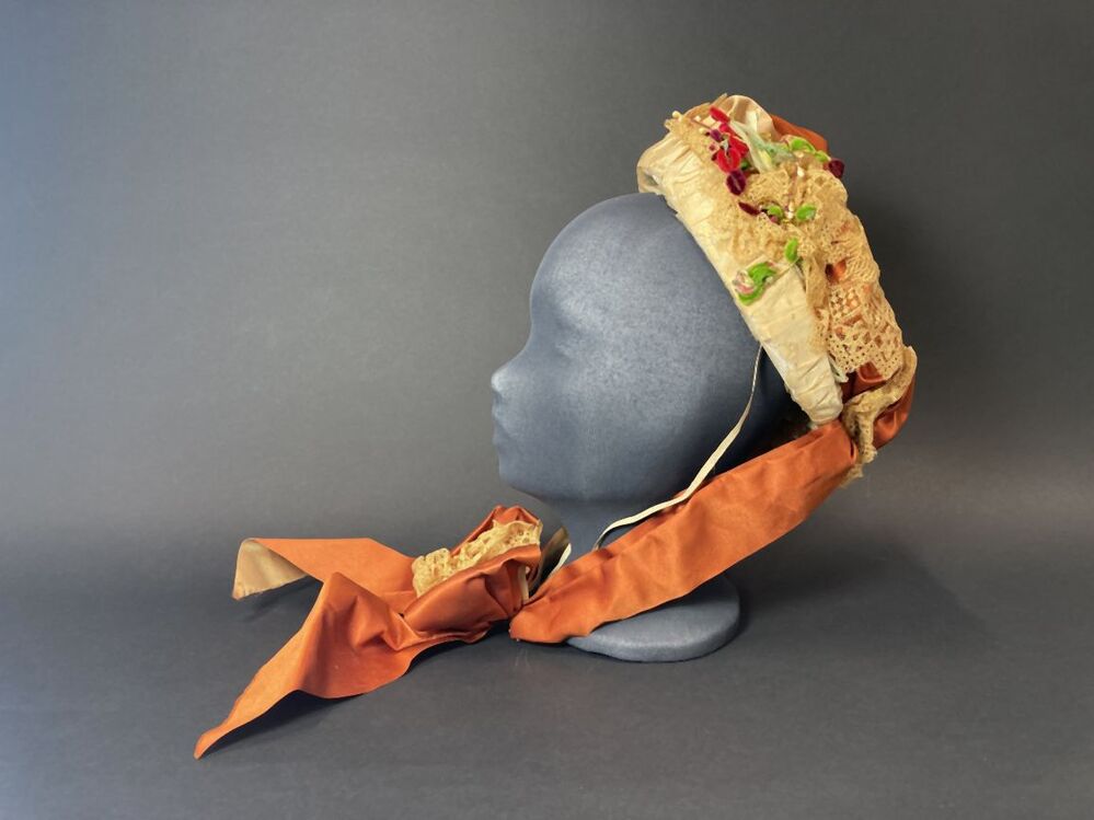 Witte strohoed, toque met cognackleurig lint en beige kant met kunstbloemen en zijden rand