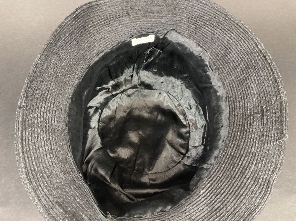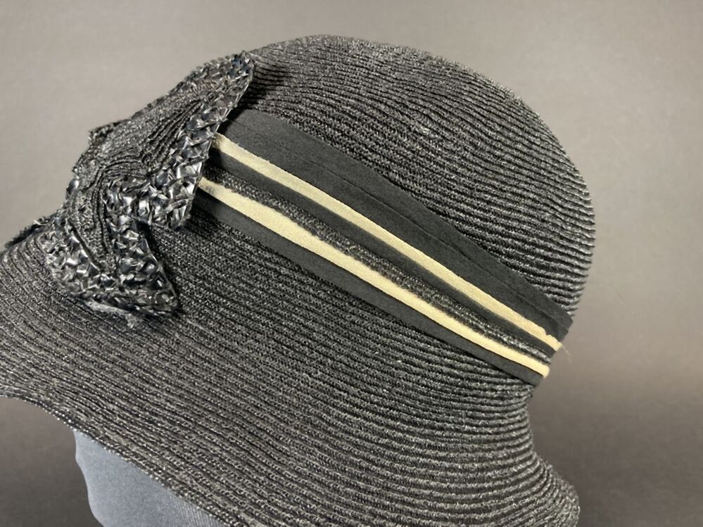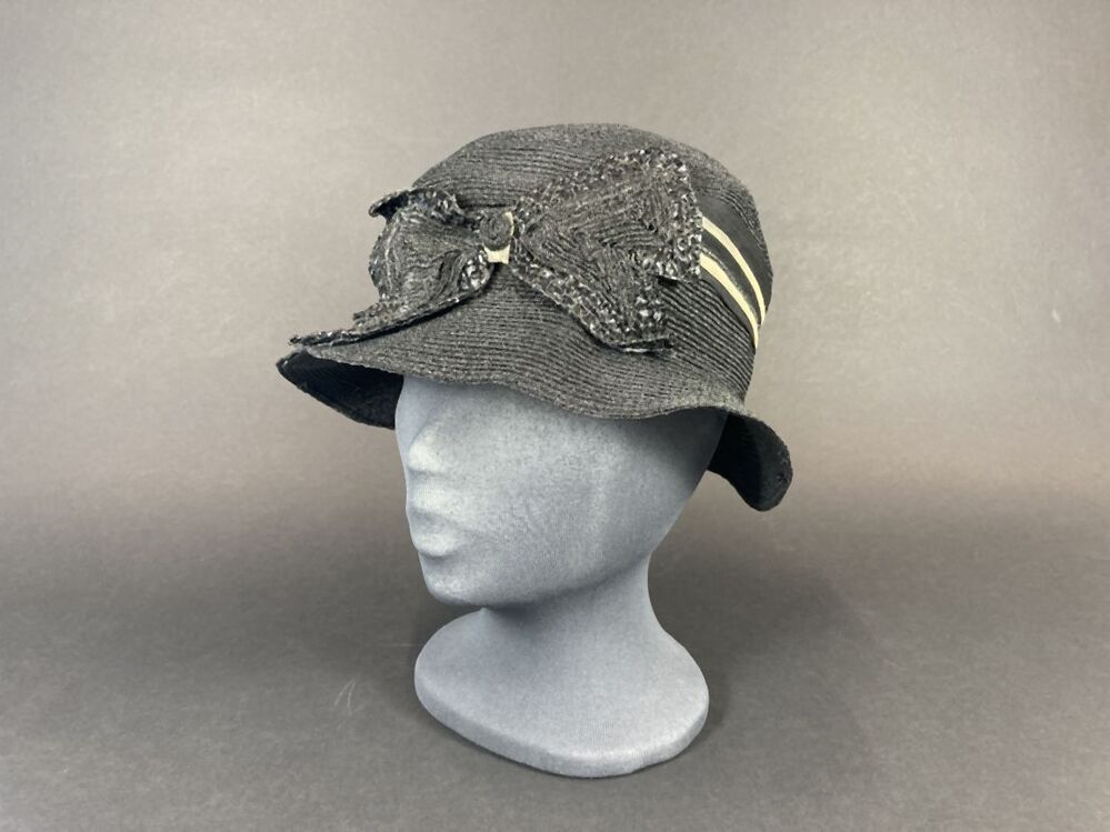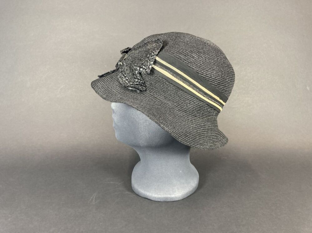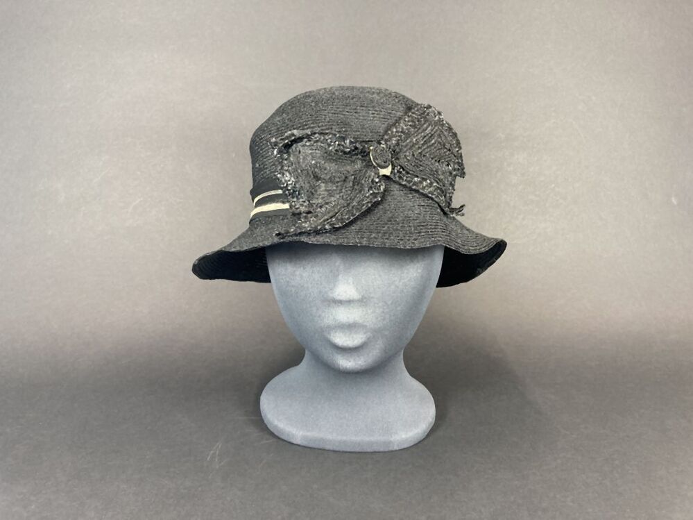 Zwart hoedje van glanzend kunststof stroband met asymmetrische band en vlinder