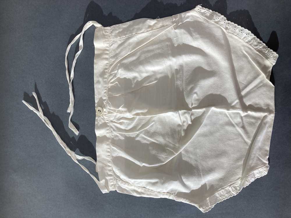 Onderbroekje met klepsluiting, afgewerkt met broderie, schuin oplopende pijpjes, afgezet met broderiekantje, binnengekomen in groep van twee