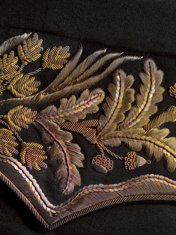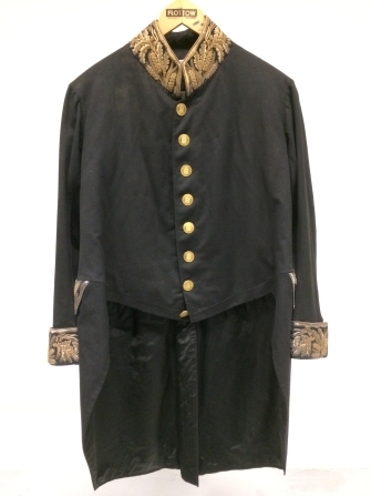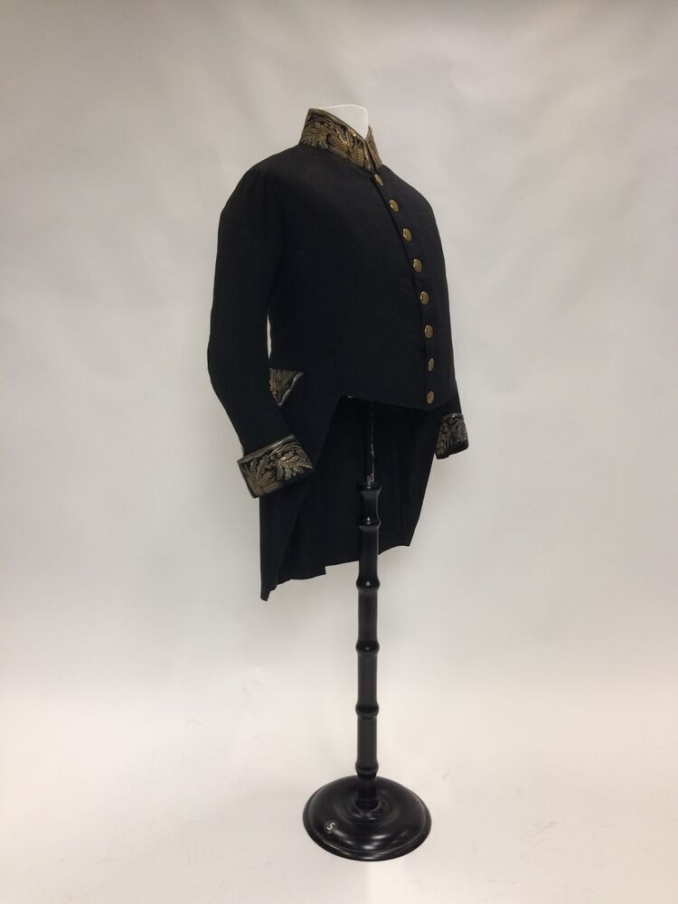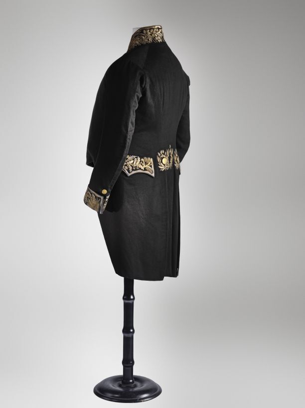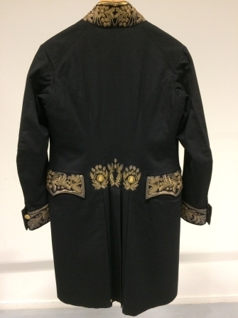 Jas van ambtskostuum van statenlid of gedeputeerde van de provincie Friesland, met goudborduursel en knopen met wapen van Friesland