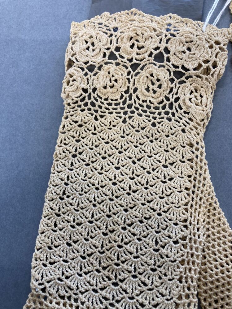 Paar gehaakte crème katoenen dameshandschoenen met bloemmotief als manchet