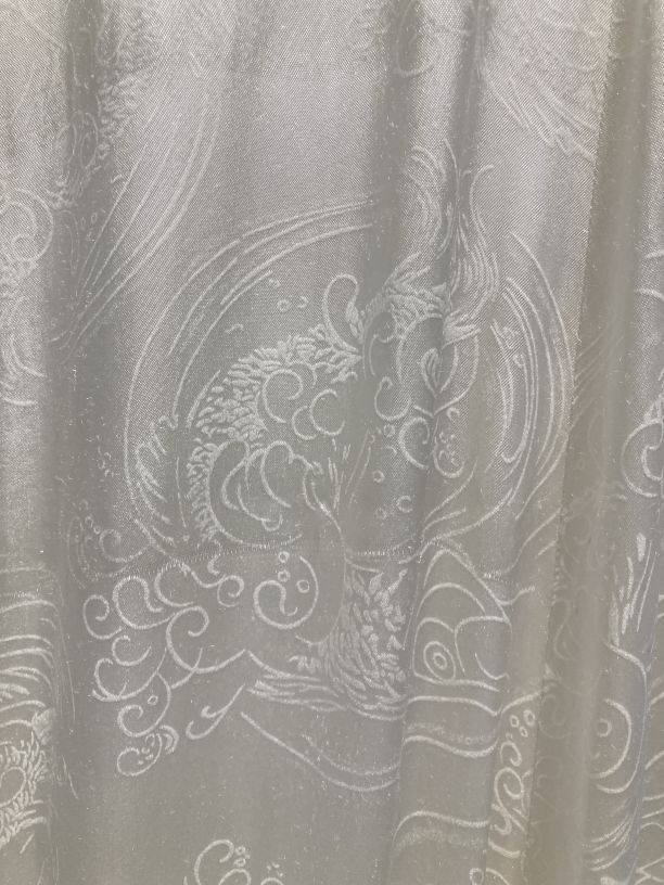 Bruidsjapon van witte bedrukte satijn met lange pofmouwen en sleepje, hierbij handschoenen (B)