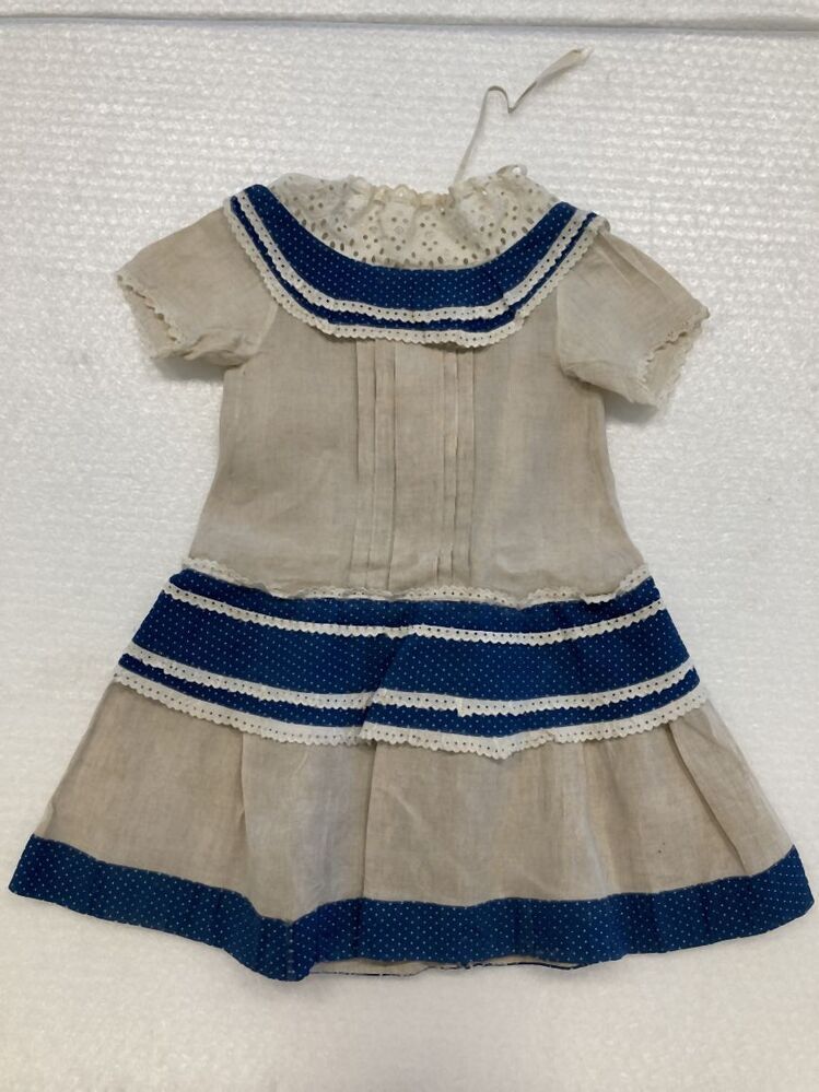 meisjesjurk van ongebleekt linnen afgezet met gestipt katoen en broderie