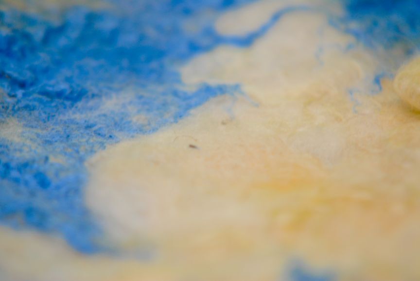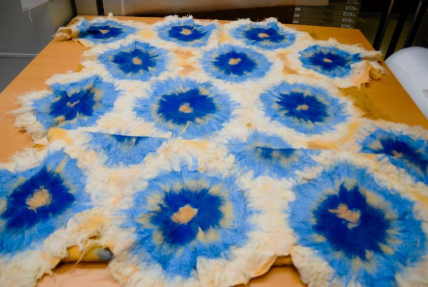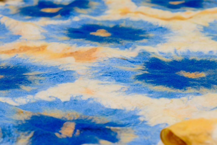Sprei van vilt-rozetten op zijden voile in blauw met geel, contouren van witte ruige wol