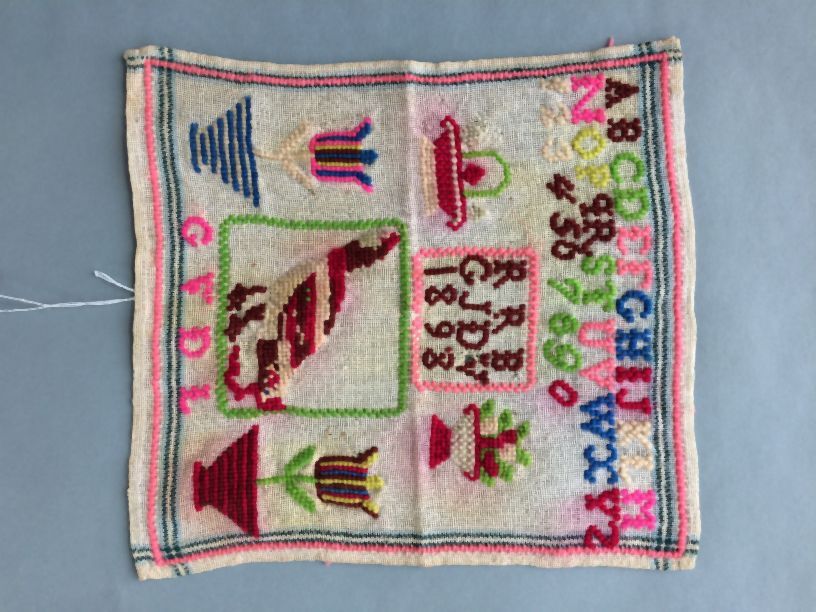 Merkletterlap, in kruissteek met wol op stramien, gemerkt GVDL, RRB, GJDV 1898