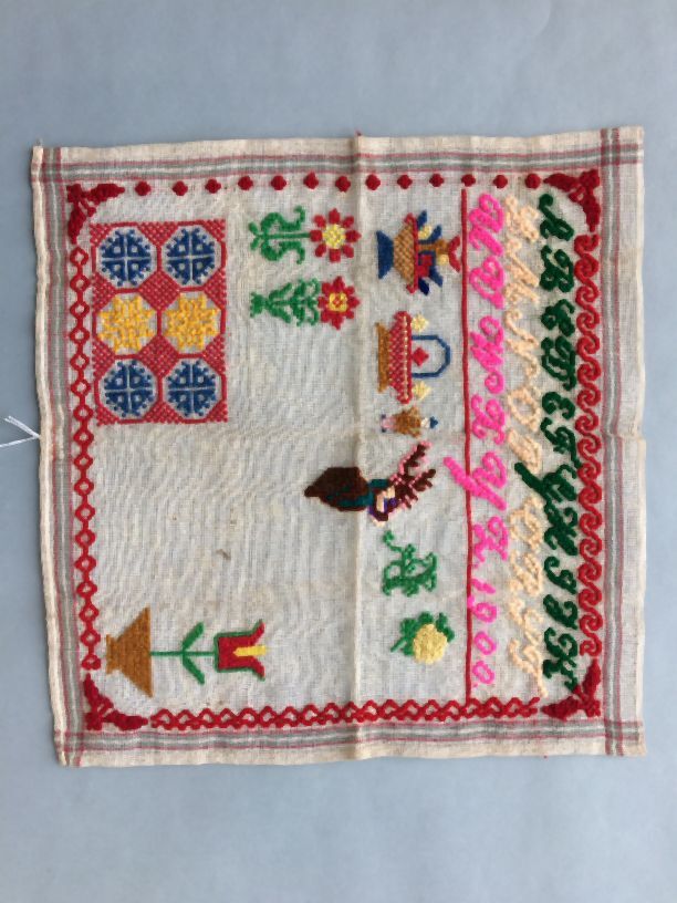 Merkletterlap, in kruissteek met wol en katoen op stramien, gemerkt 1898