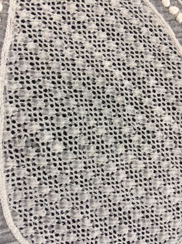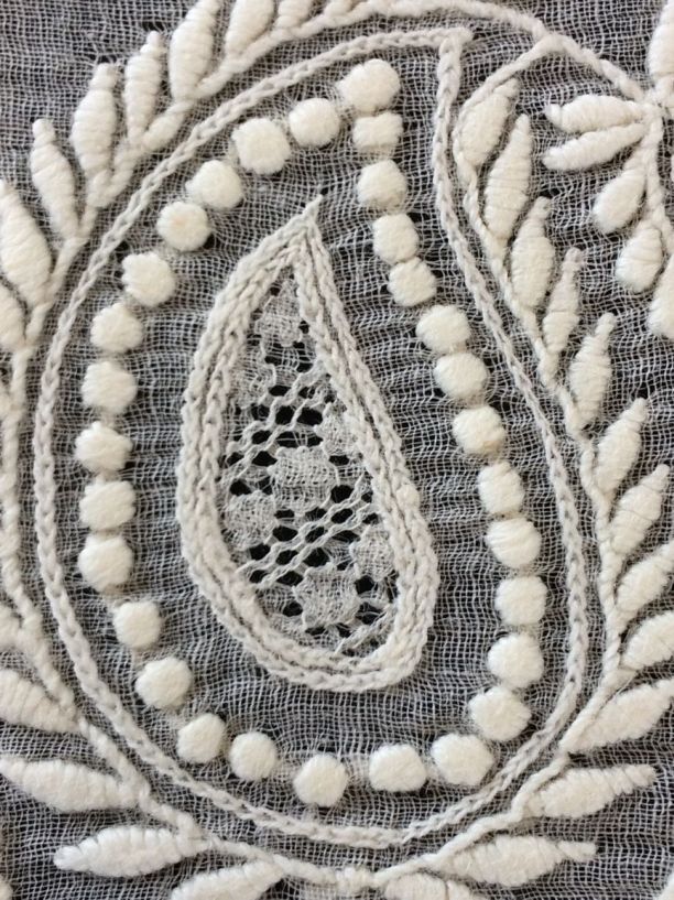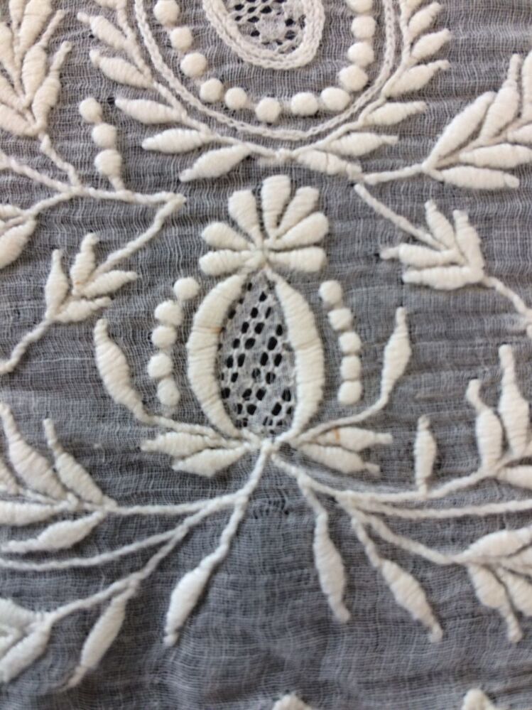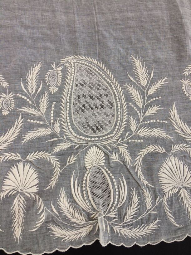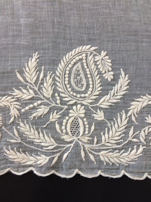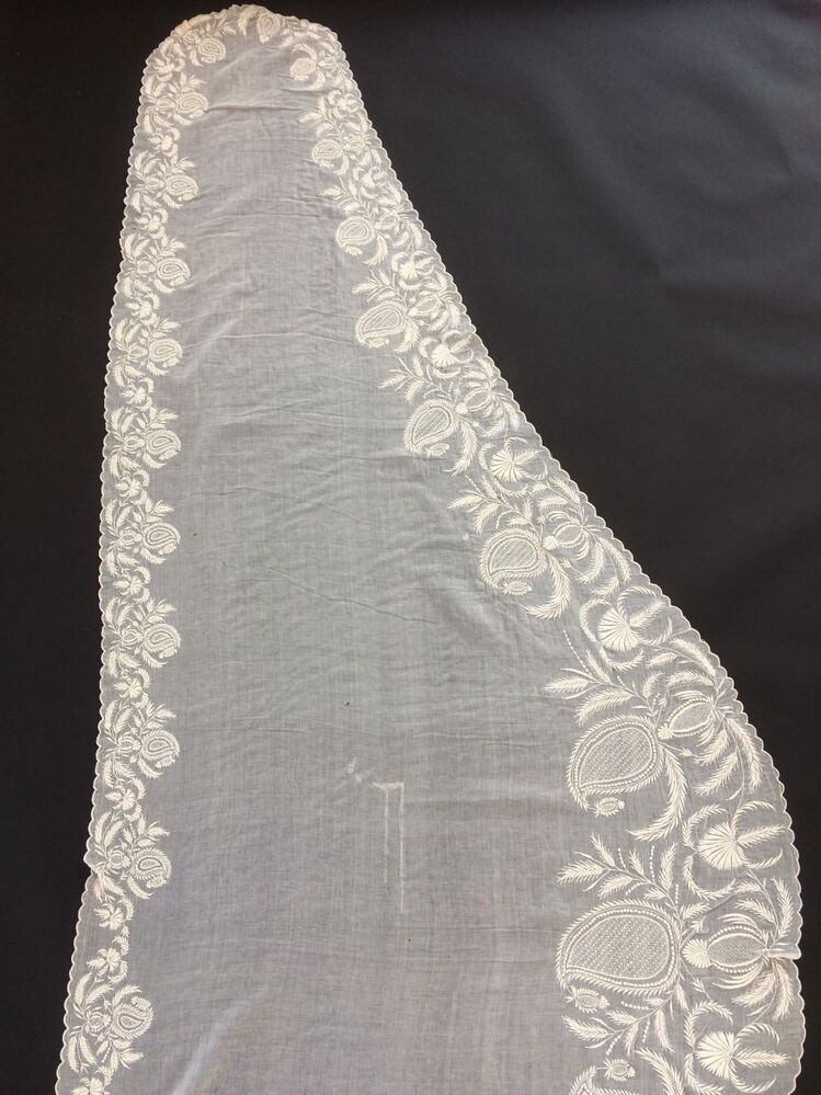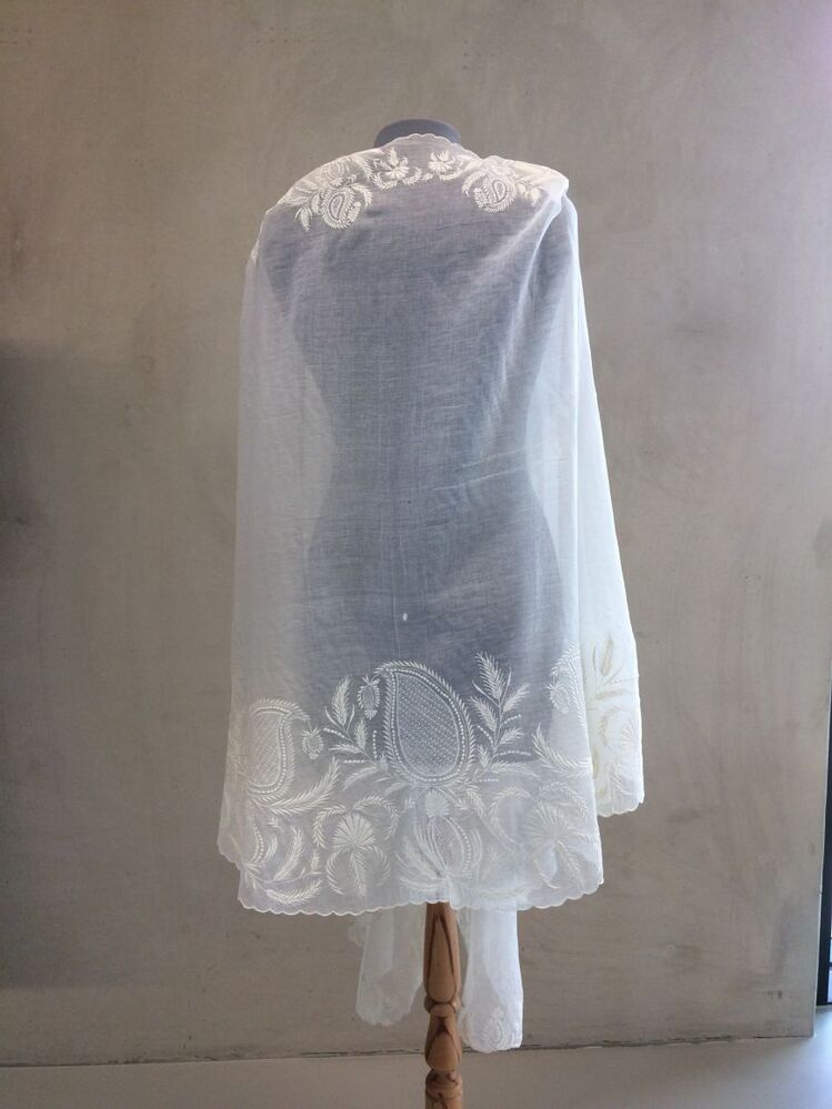Langwerpig afgeronde sjaal van wit batist met geborduurde butamotieven