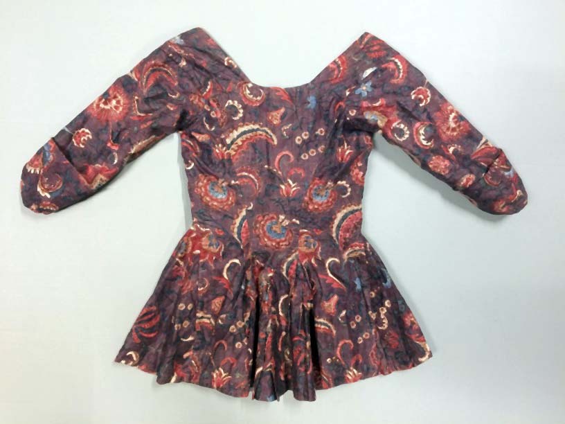 Vrouwenjak met vestpandjes en aangeknipte schoot van sits met paarse grond beschilderd met middelgroot exotisch bloemmotief