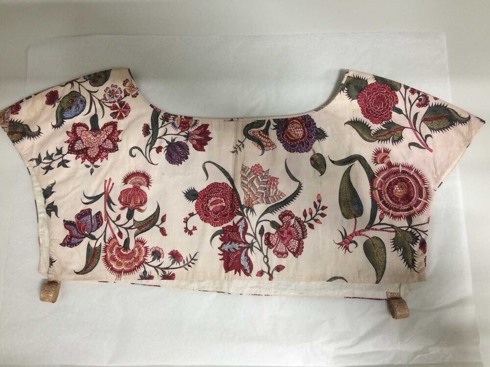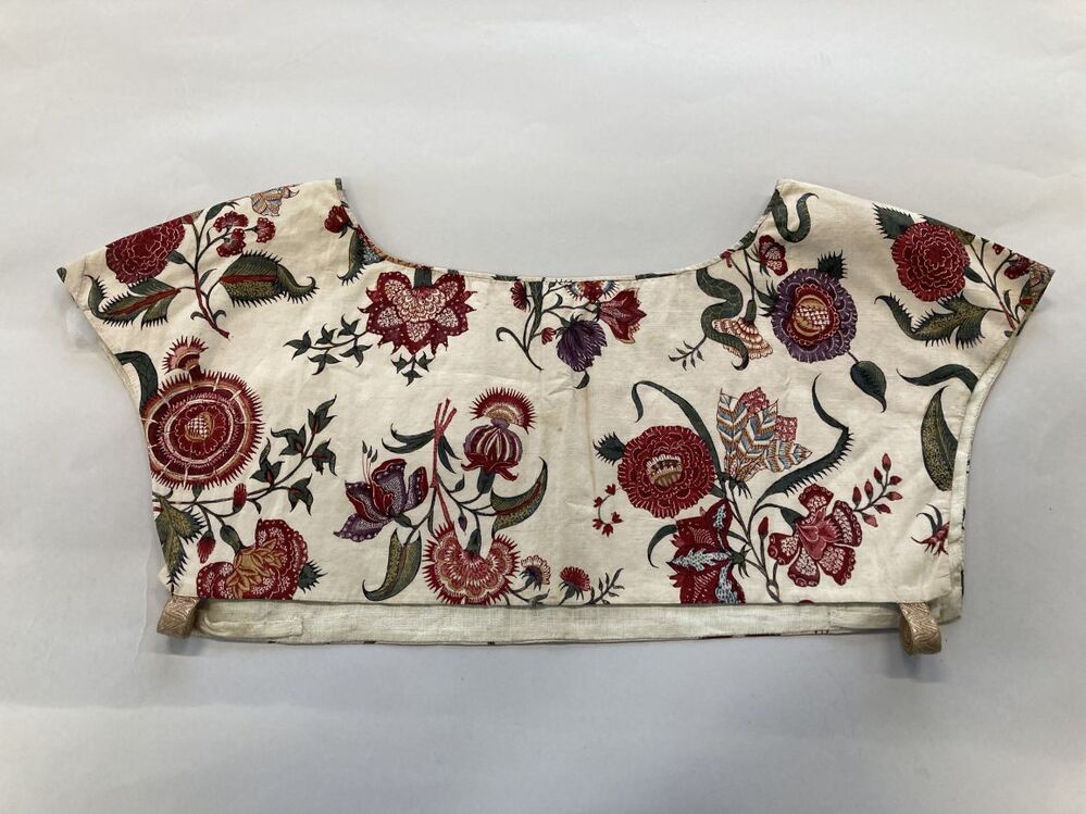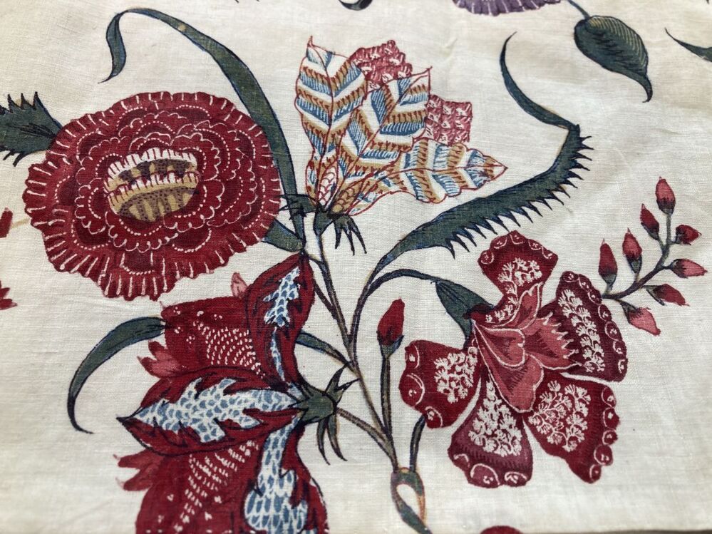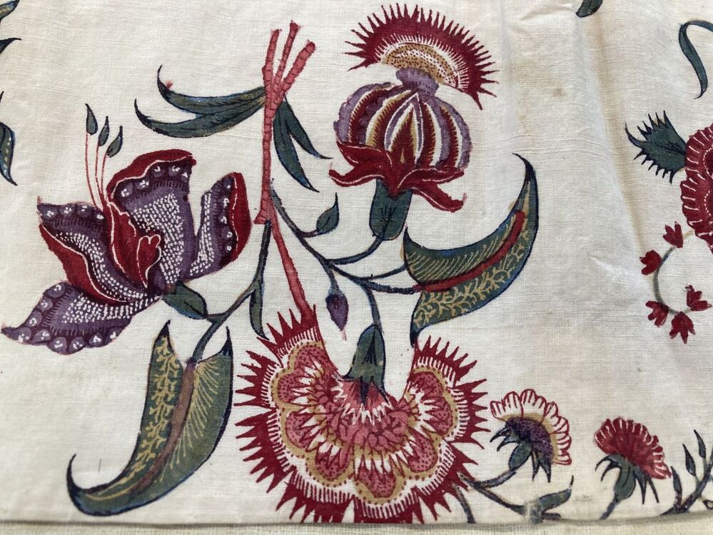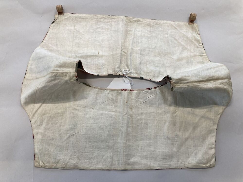 Onderst of kroplap van sits waarop veelkleurige boeketjes met diverse bloemen op witte grond