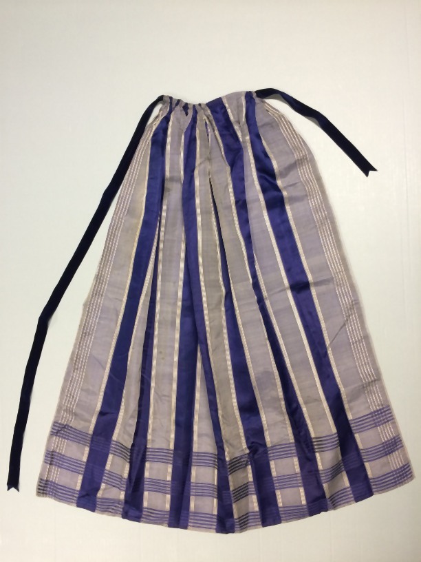 Smal schort van blauw-lichtgrijs gestreepte zijde, afwisselend satijn en taft