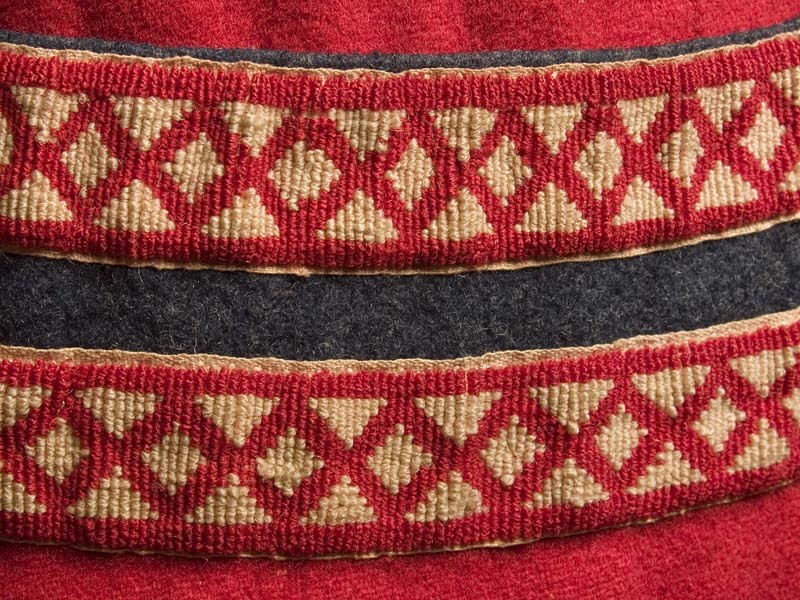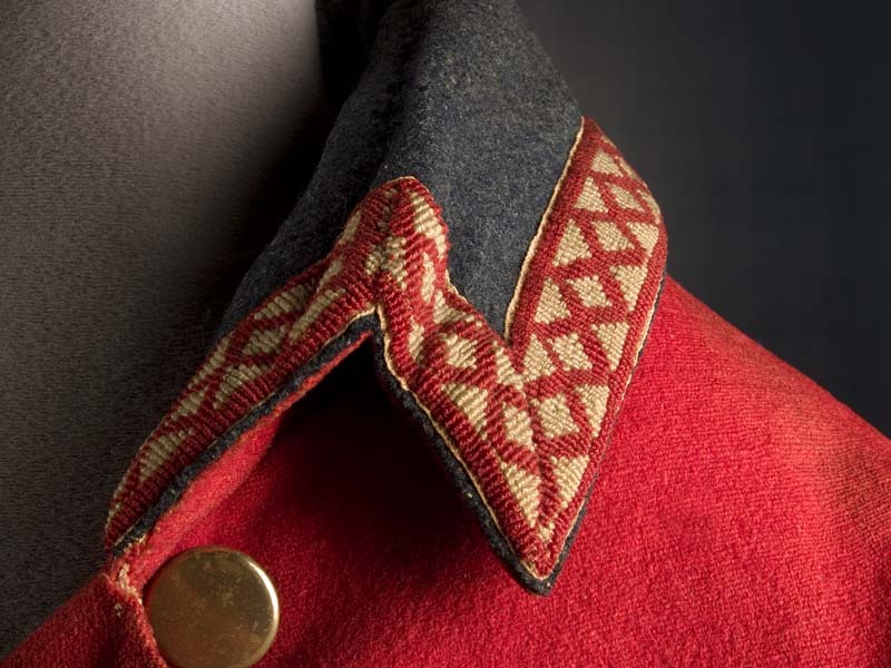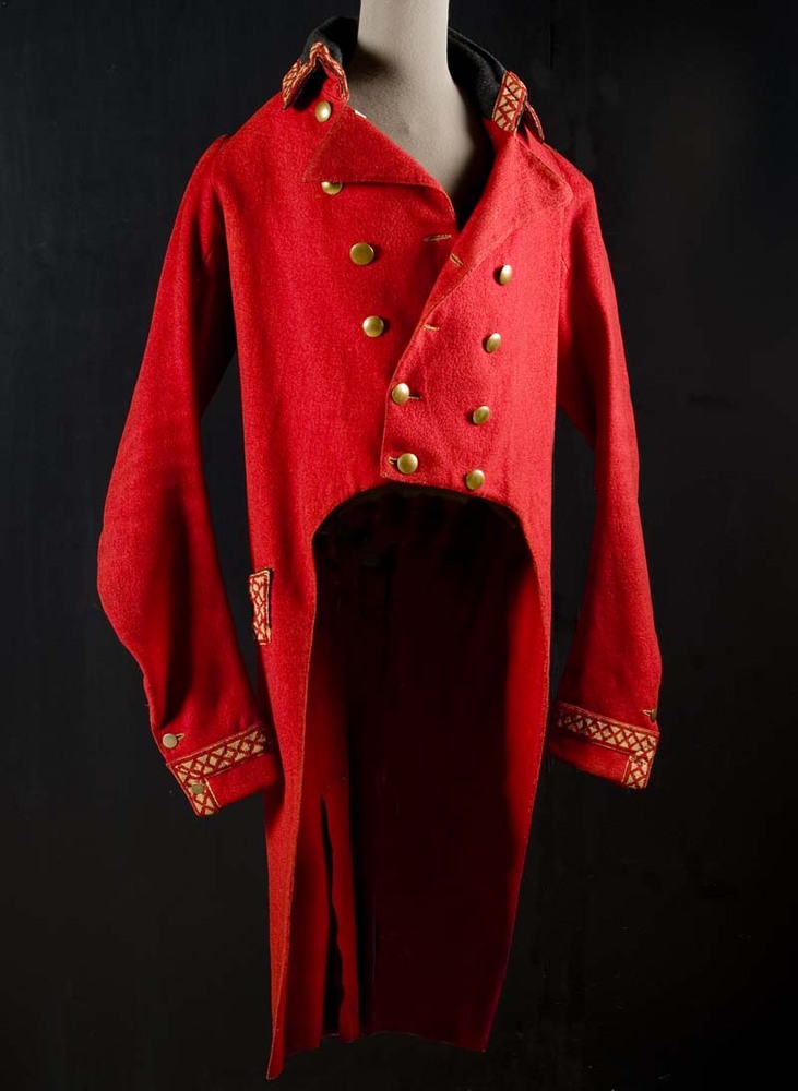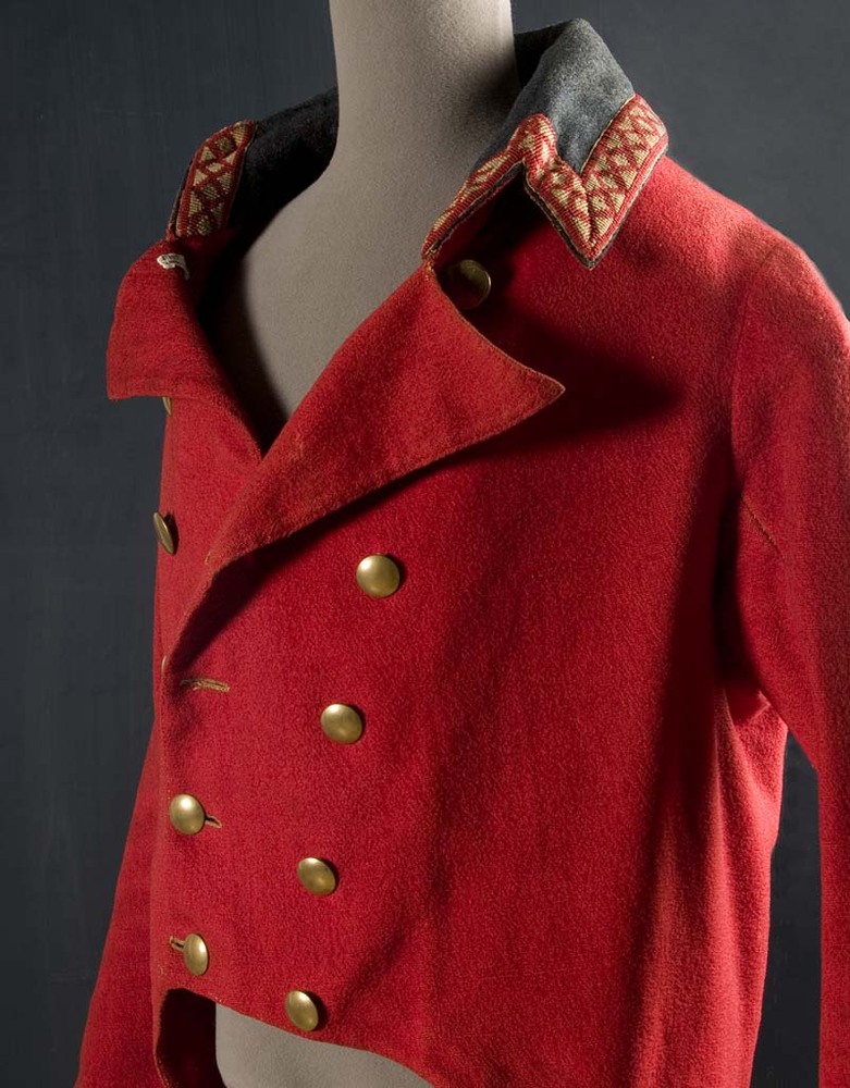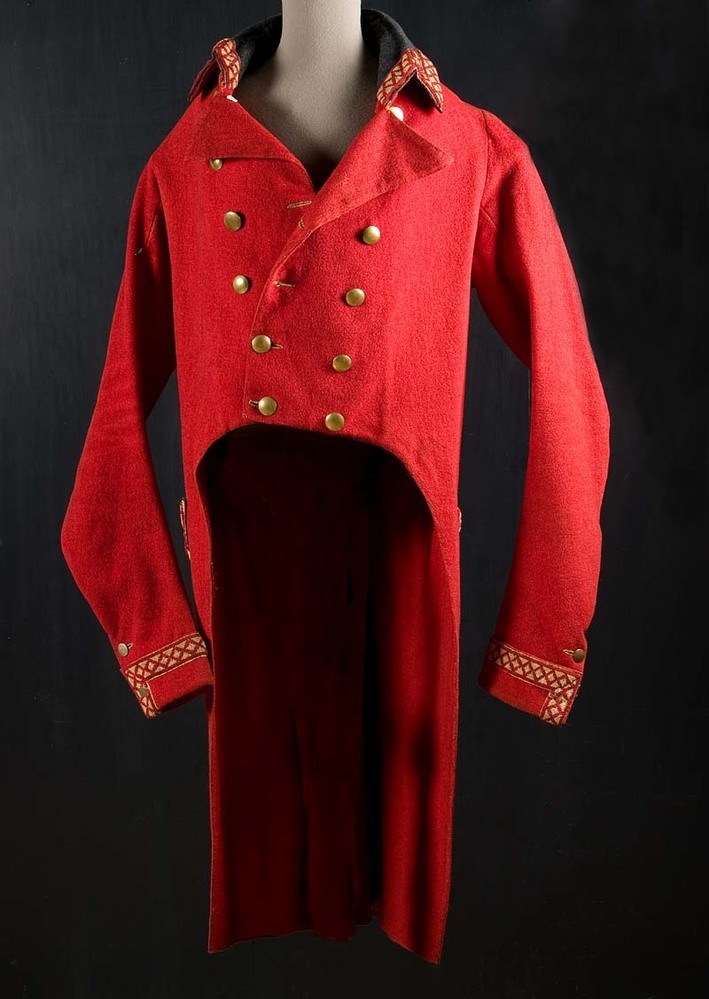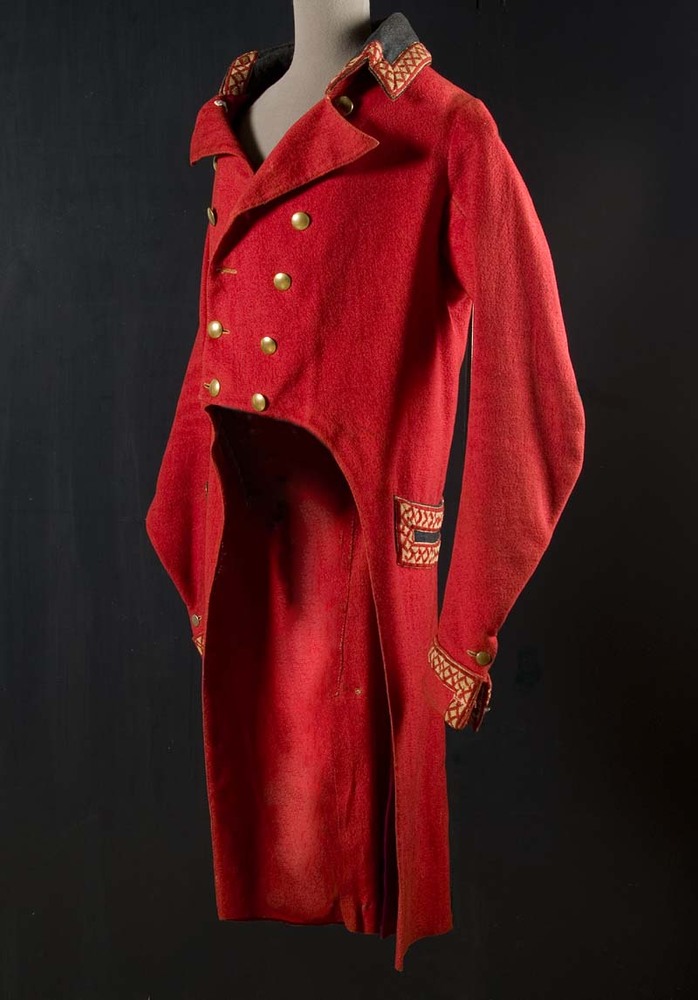 Rode wollen livreijas met opstaande blauwe kraag, afgezet met wollen livrei-band. Met revers en manchetten, lijf en mouwen gevoerd