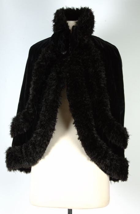 Zwart fluwelen cape met dubbele rand veren gevoerd met gewateerde zijde