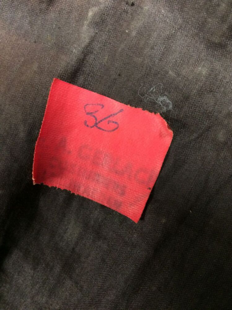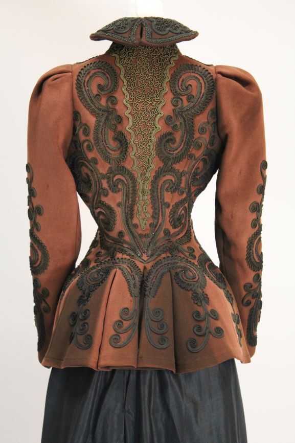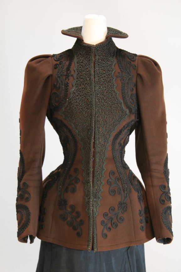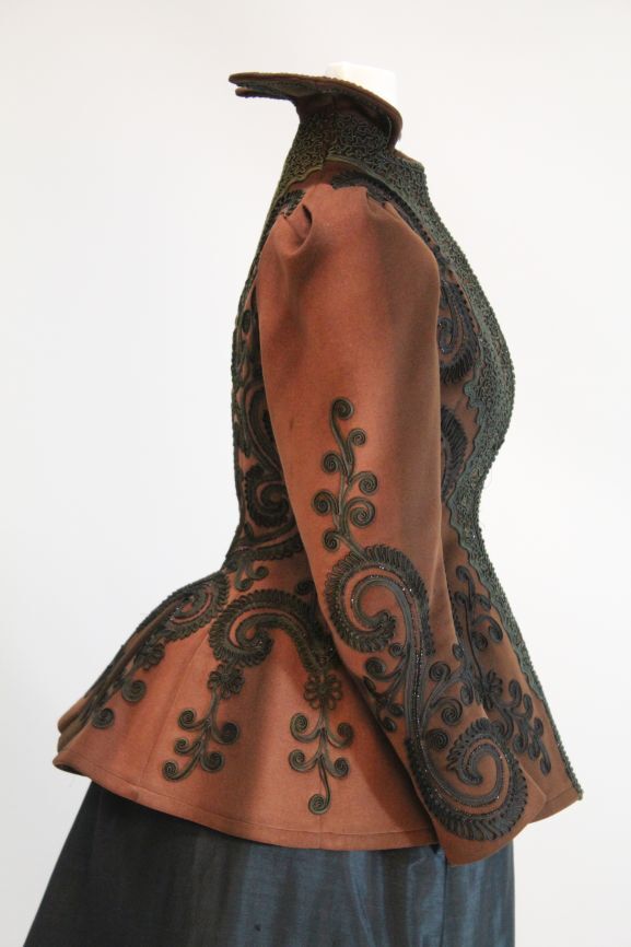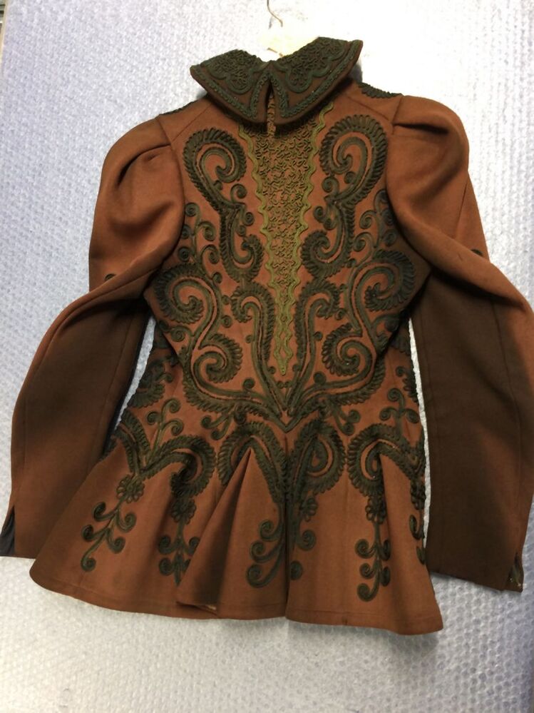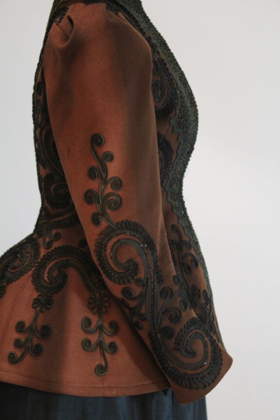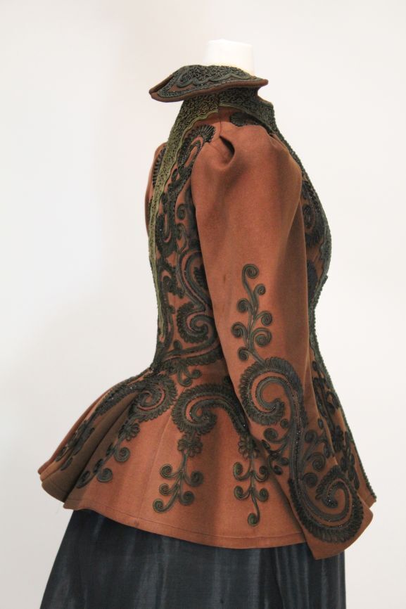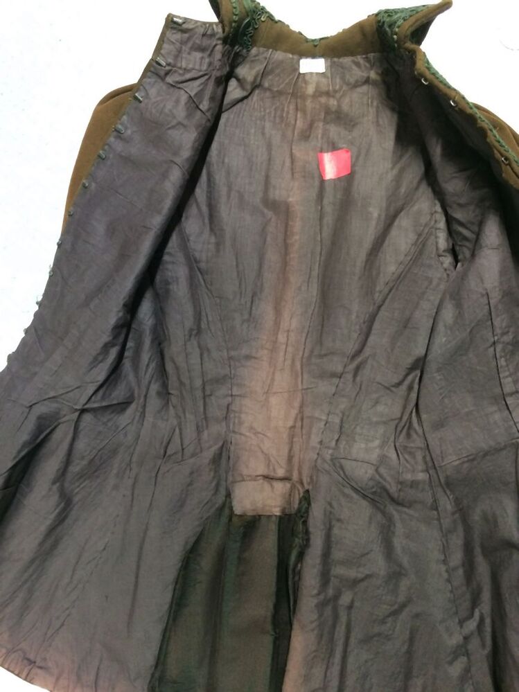 Donkerbruine wollen jas met opgenaaid band gevoerd met zijde