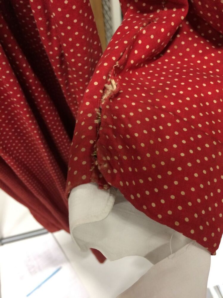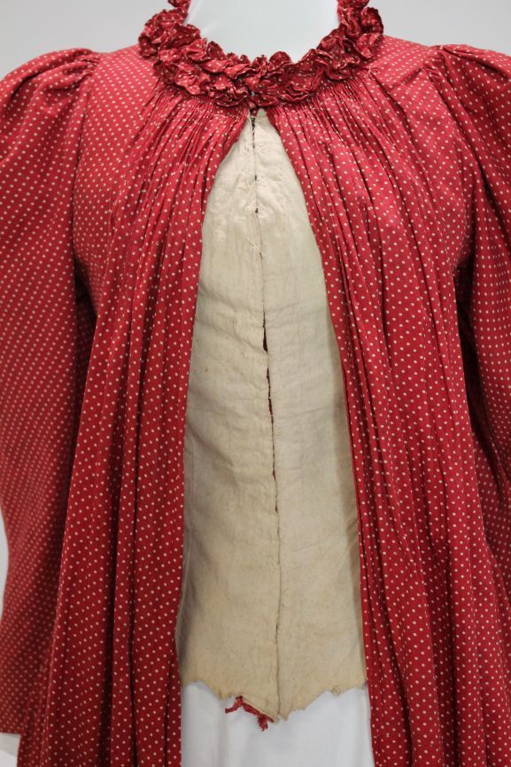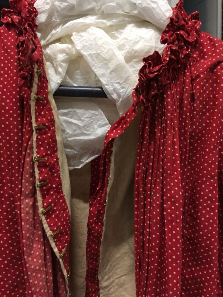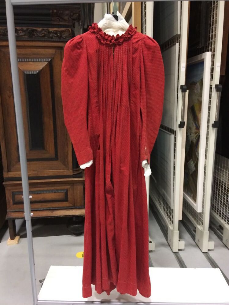 Lange katoenen rode jurk met witte stipjes voor 'jonggehuwde' vrouw met lange mouwen.