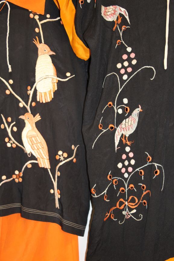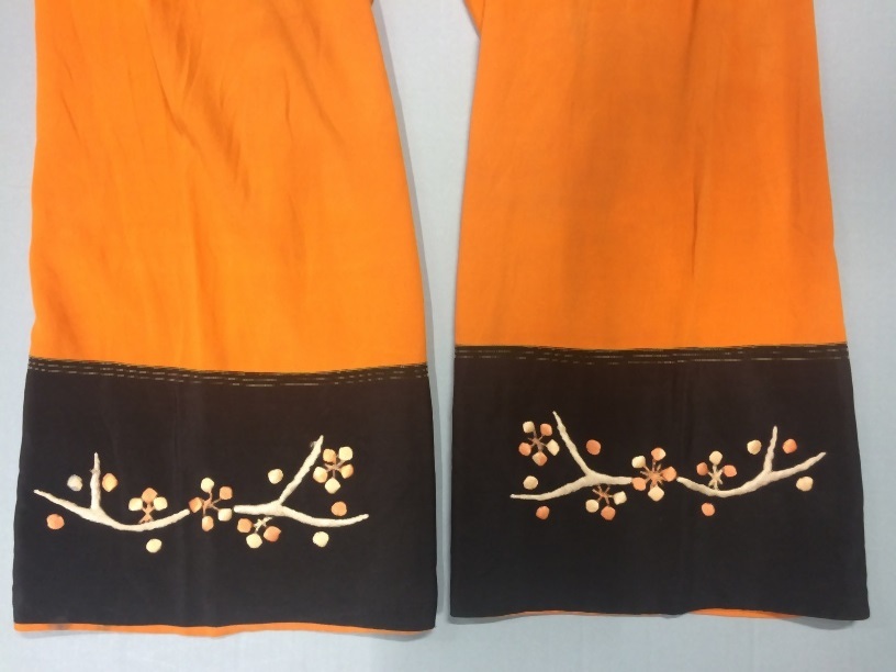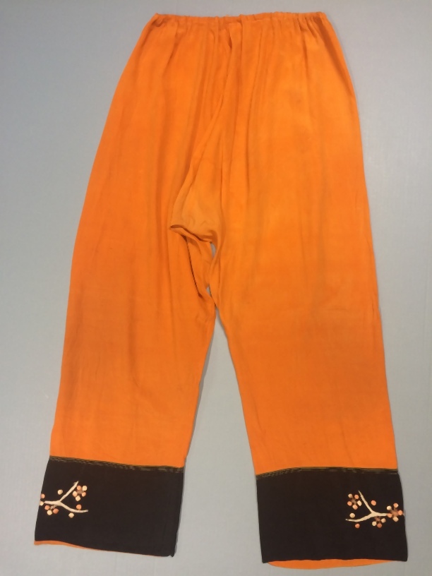 Zwart oranje zijden pyjamabroek met opgeborduurde takken en bessen, onderdeel van twee paar vergelijkbare pyjama's