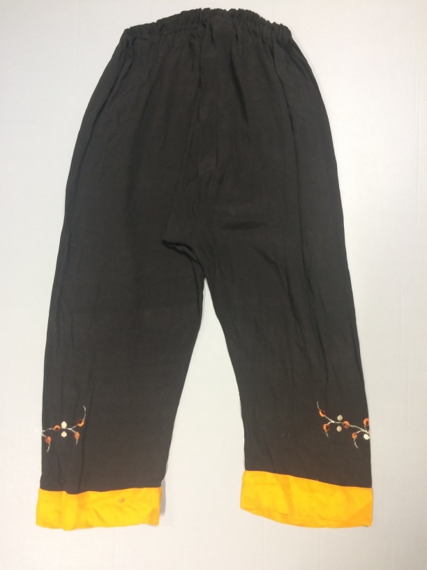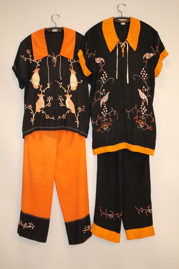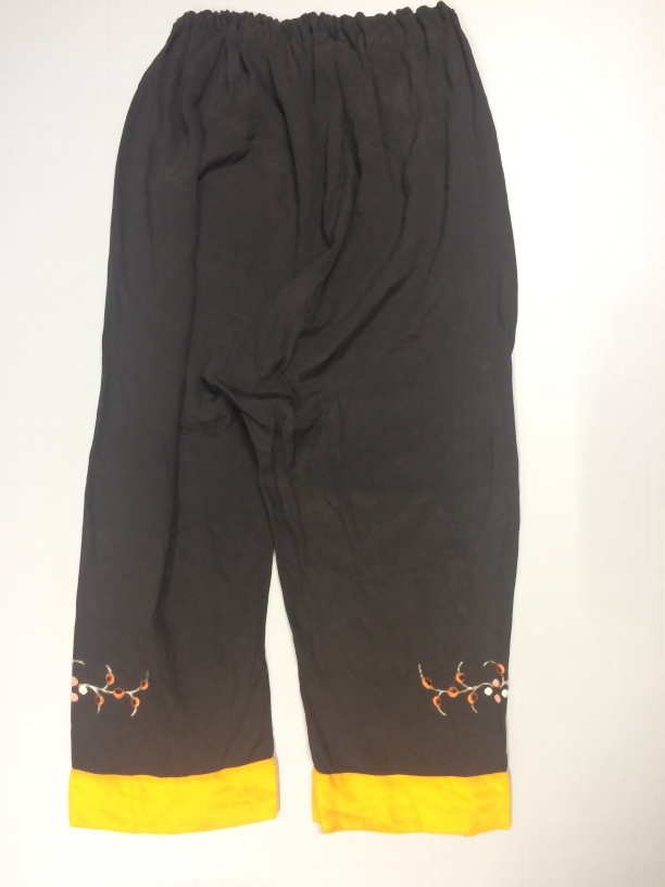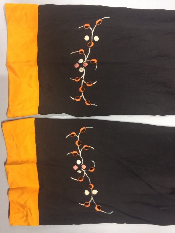 Zwart oranje zijden pyjamabroek met opgeborduurde takken en bessen, onderdeel van twee paar vergelijkbare pyjama's