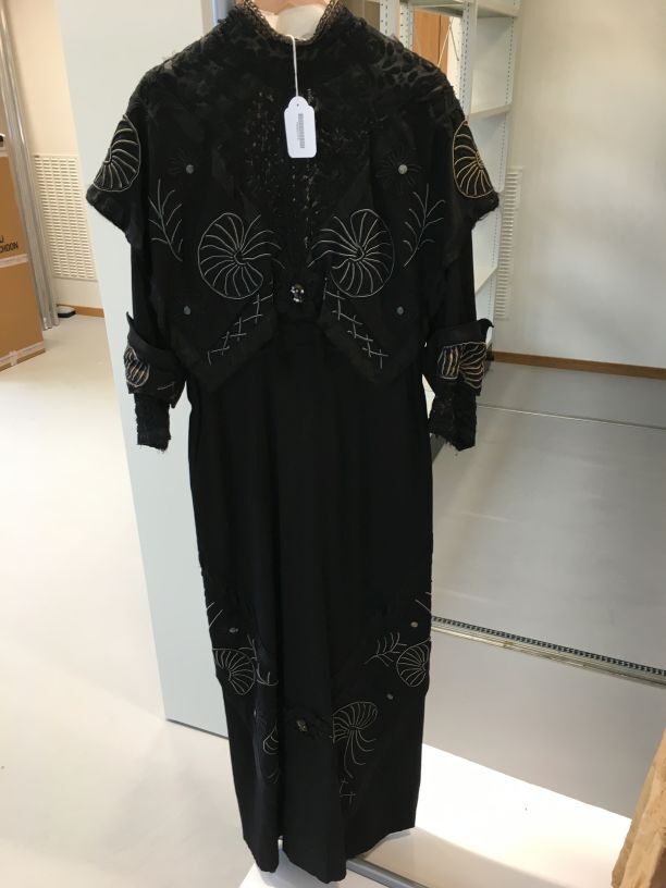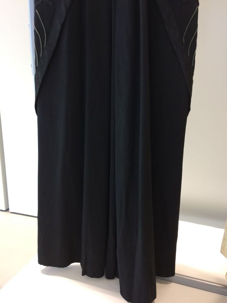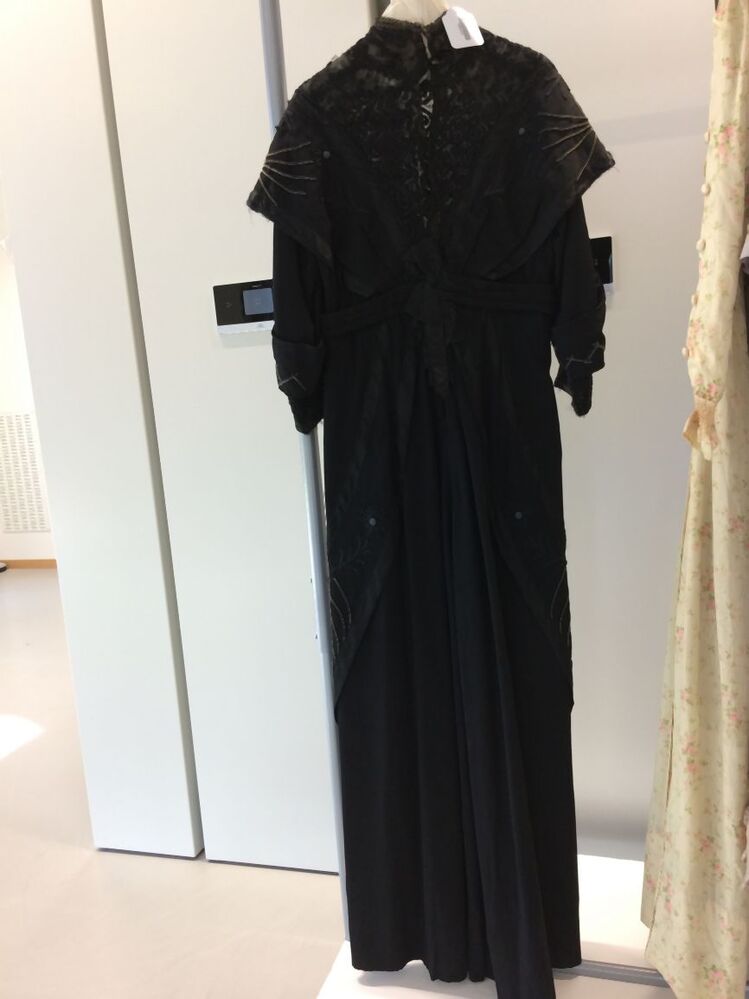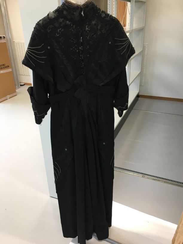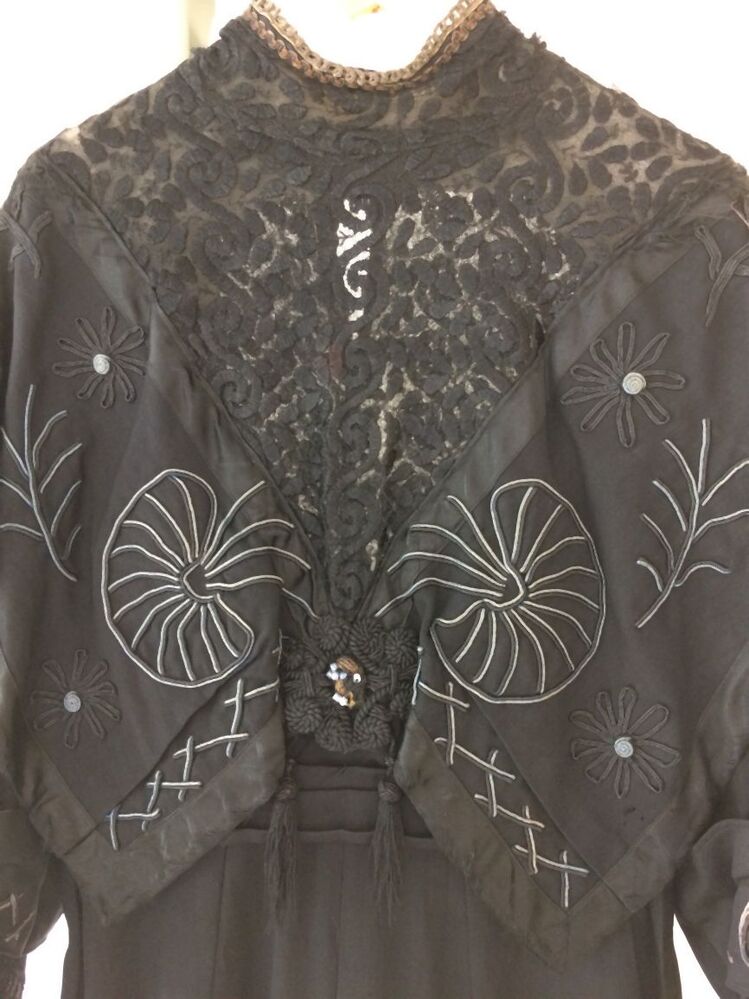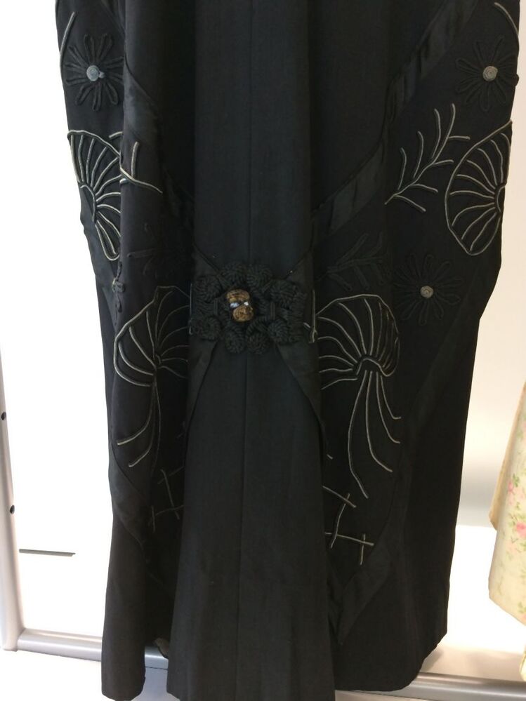 Lange zwart wollen jurk met lange mouwen met machinaal geborduurde kunstzijde