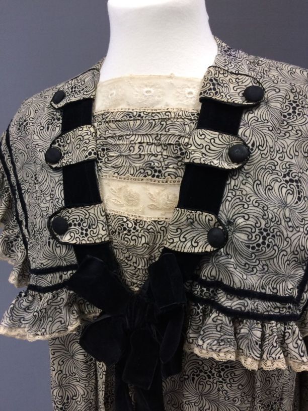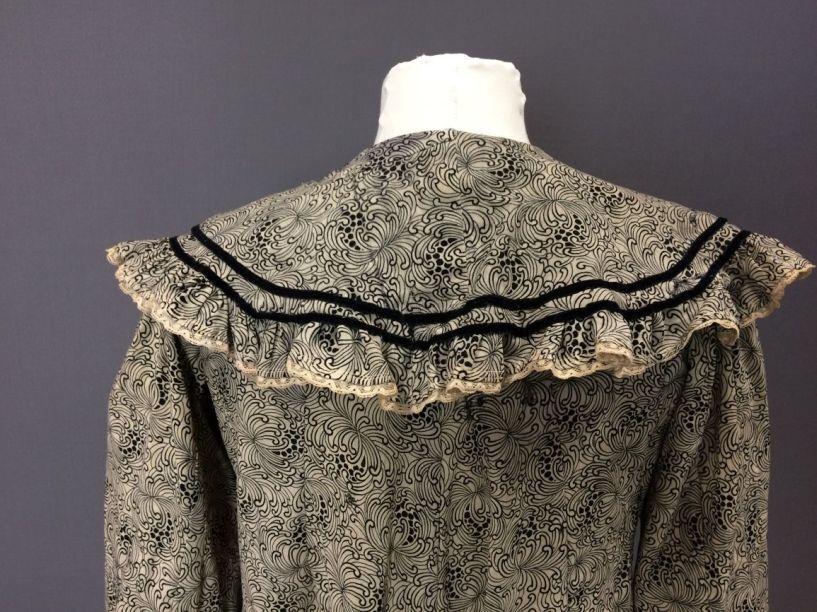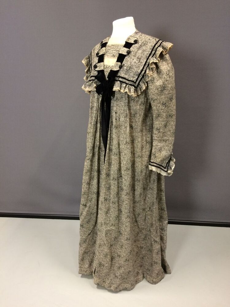 Zwart-witte huisjurk of teagown met grote kraag van wollen mousseline bedrukt met floraal patroon