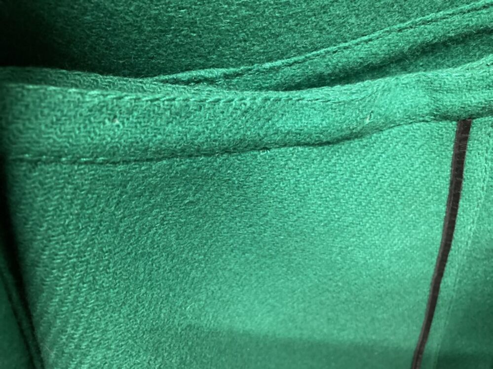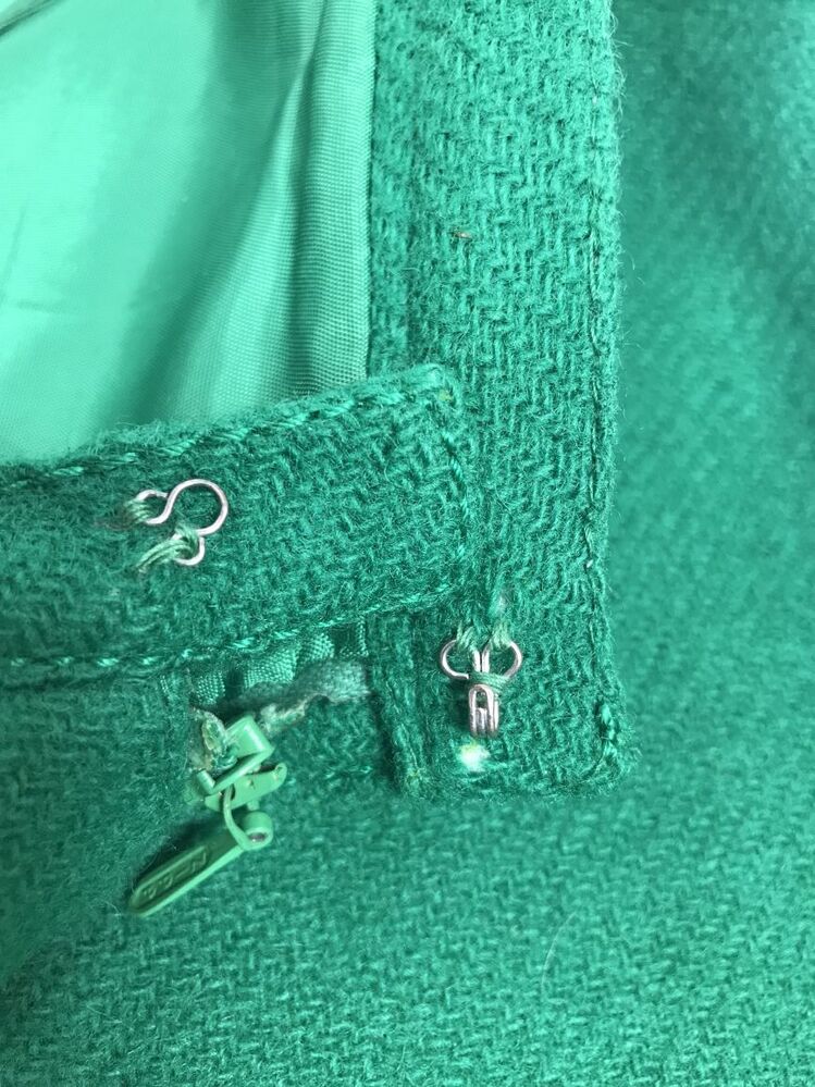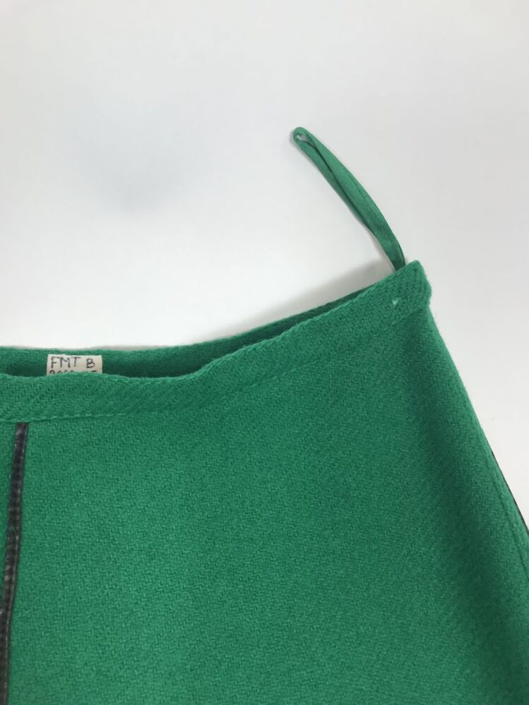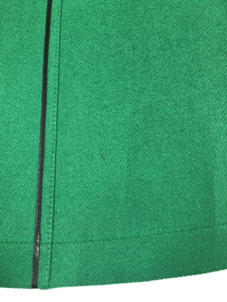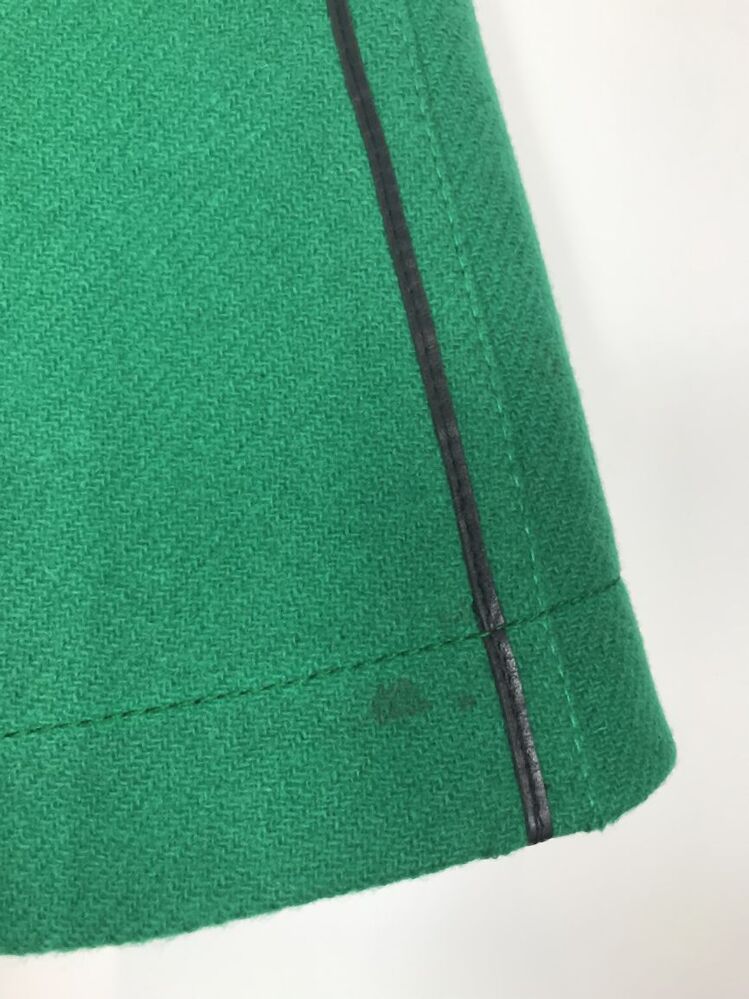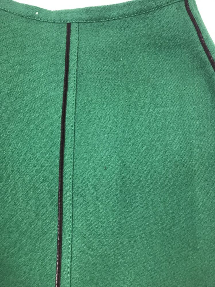 Rok, onderdeel van knalgroen wollen pakje met zwart leren bies