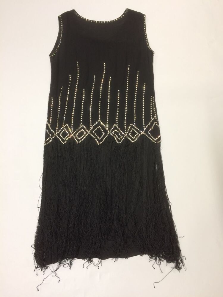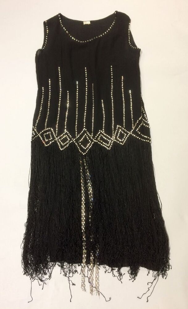 Zwarte jurk van dubbele laag crepe met strass steentjes en sliertjes