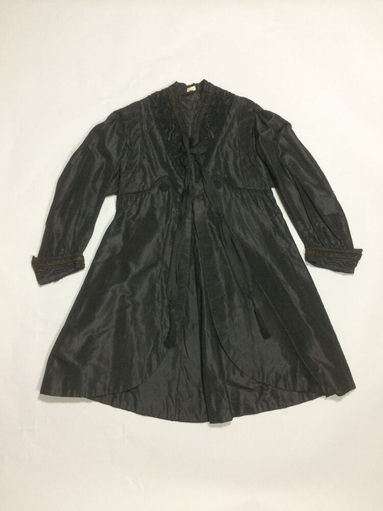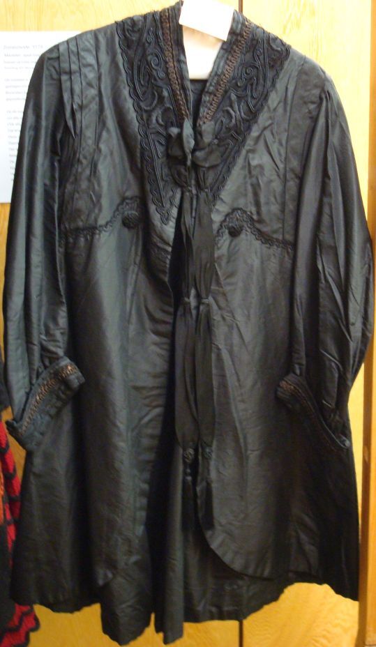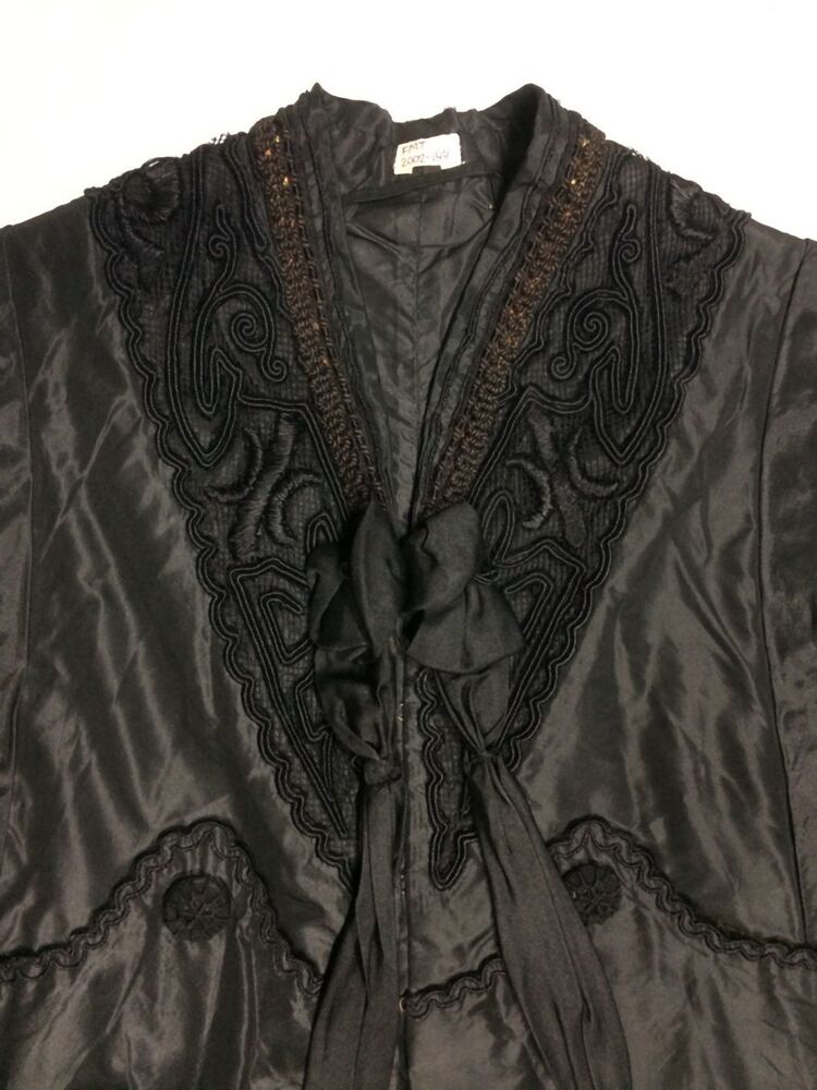 Zwart zijden jasje met plooien en versiering rond de hals