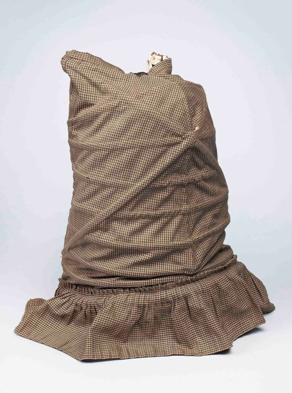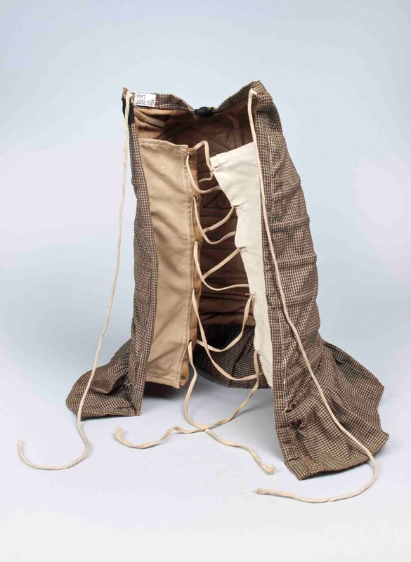 Groen wit geblokte tournure met baleinen, voor het Queue de Paris silhouet