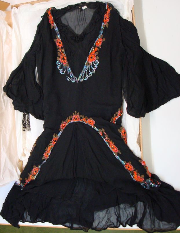 Zwarte voilen dubbele jurk met oranje kraaltjes en pailletjes