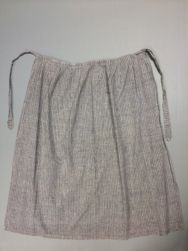 Blauw wit geblokt schort, dat geplooid aan tailleband is gestikt, de tailleband sluit midden door middel van strik