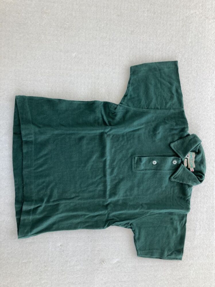 Groen poloshirt, kraagje met splitsluiting door middel van twee knopen en knoopsgaten, onderdeel van padvindersuniform