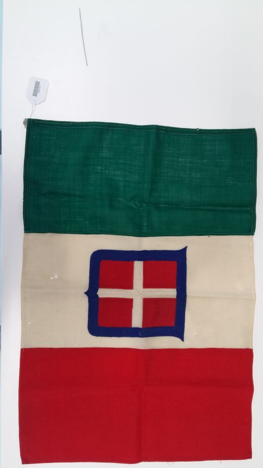 Rood, wit, groene padvindersvlag met in het witte deel een rood vierkant met wit kruis, blauw omrand
