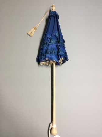Blauw zijden parasol met gerimpelde stroken en witgeverfde houten steel, gevoerd met witte zijde
