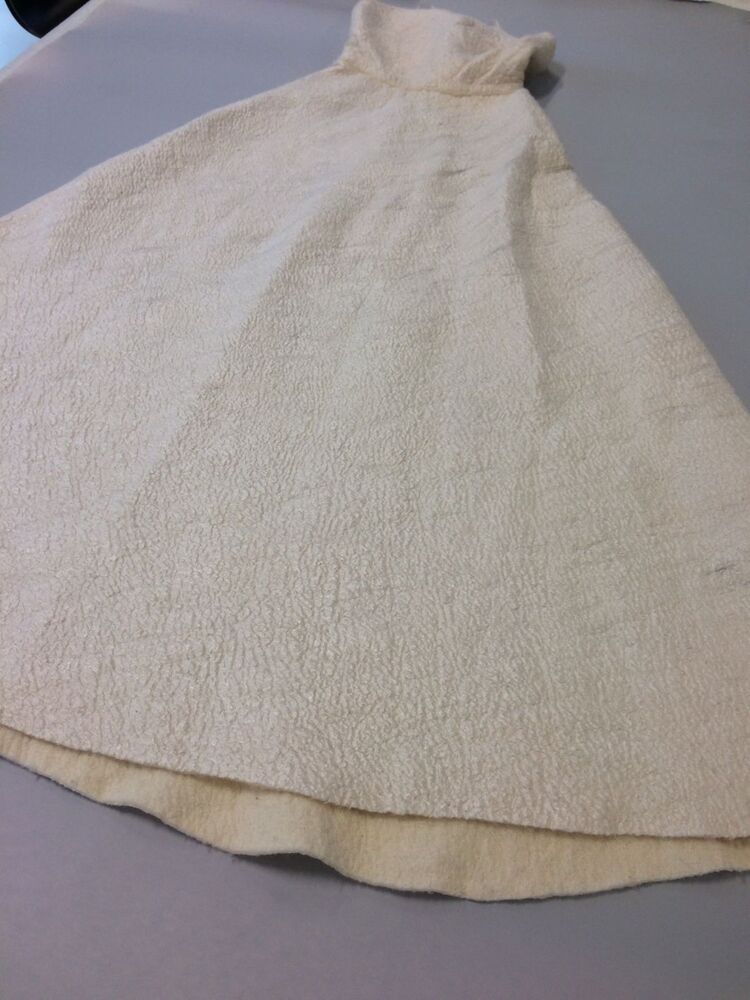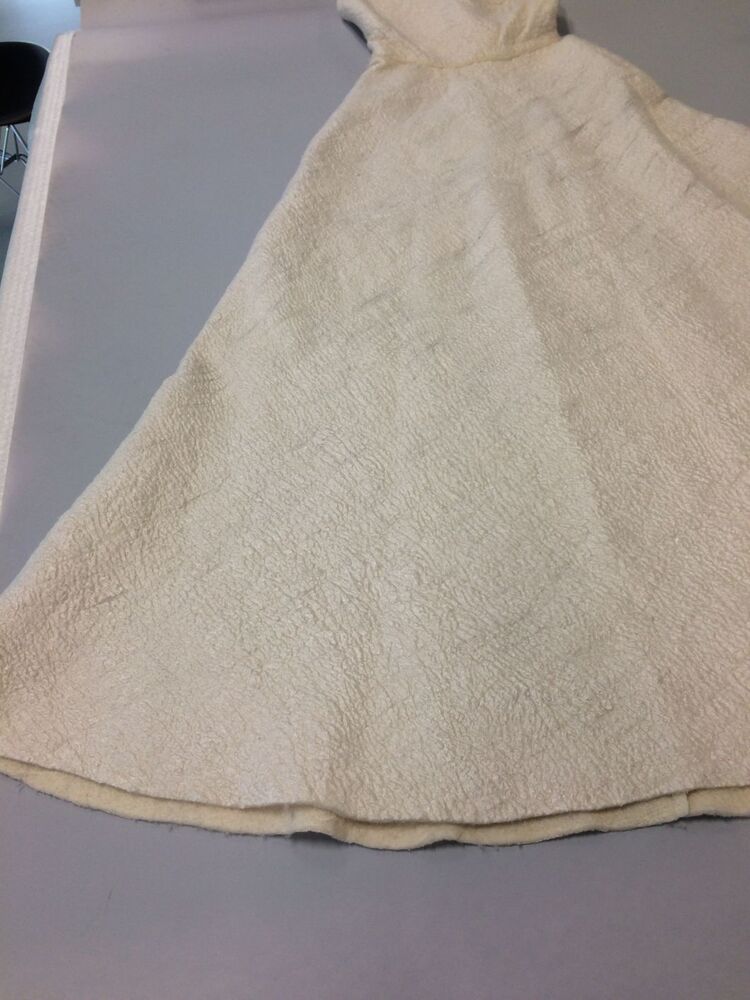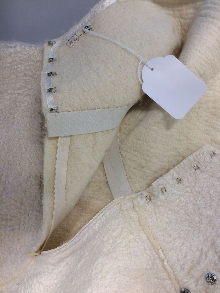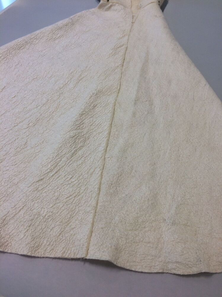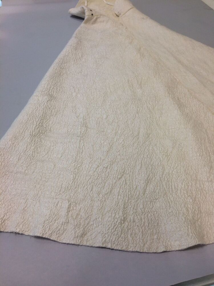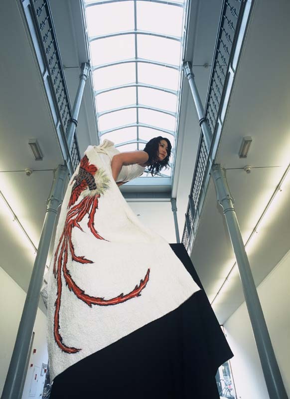 Vilten bruidsjurk met zijde, met bijbehorende sleep met vuurvogel en brede ceintuur