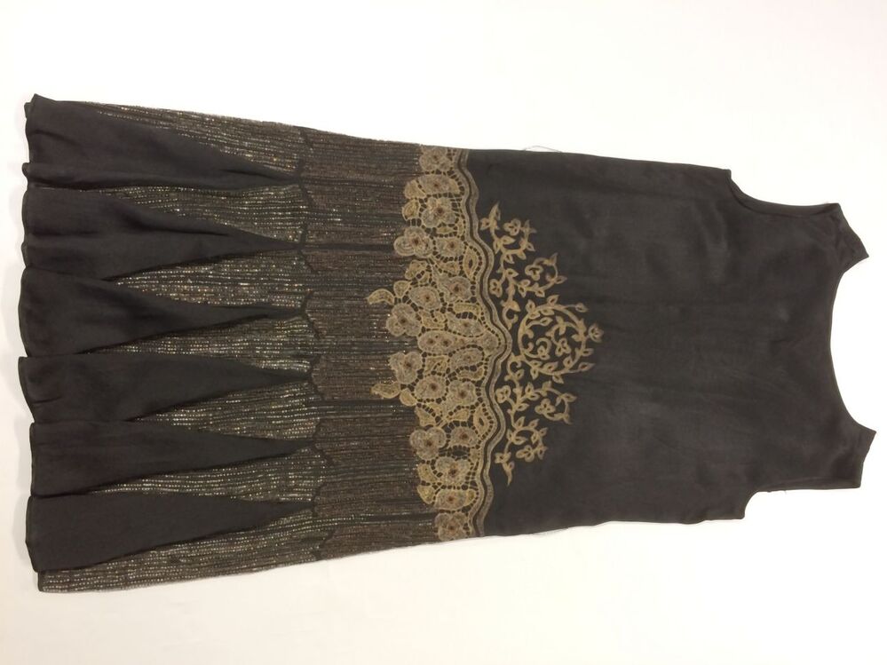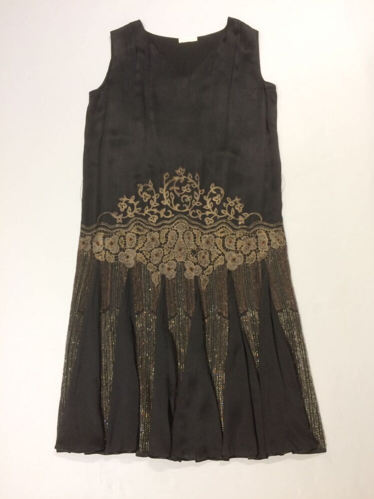 Charlestonjurk van zwarte zijde met metaaldraadborduurwerk en kralen