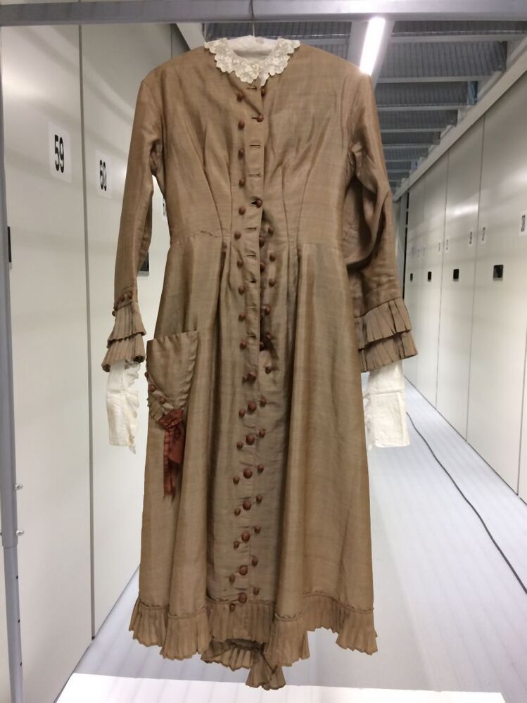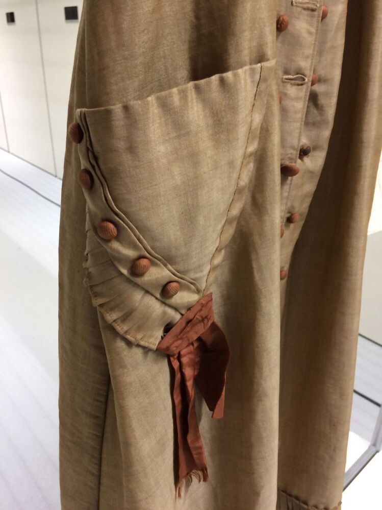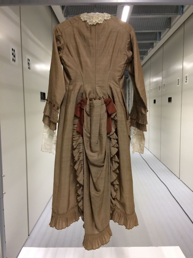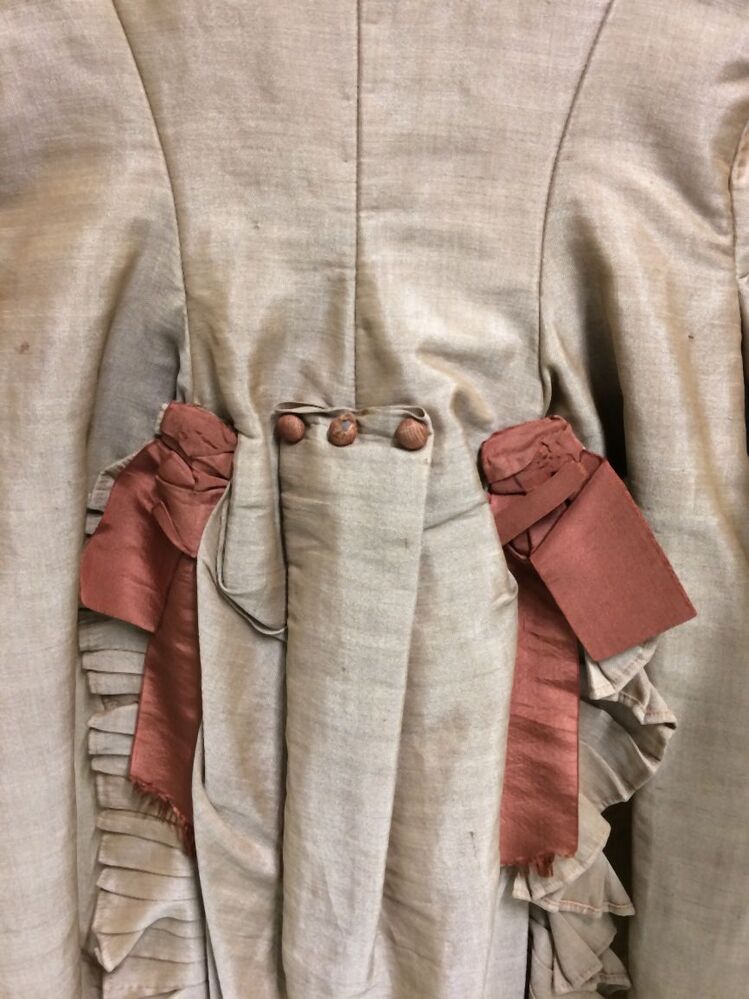 Tuniekjak met lange aangeknipte schoot met geplooide pouffe middenachter, onderdeel van tweedelige japon met tuniek, van beige luster met zijden strikken