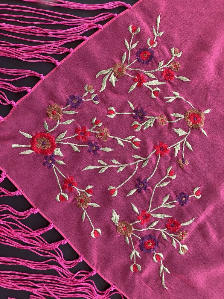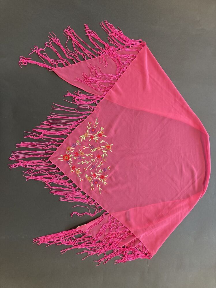 Driehoekige hardroze sjaal met lange franje en geborduurde bloemversiering in de punt