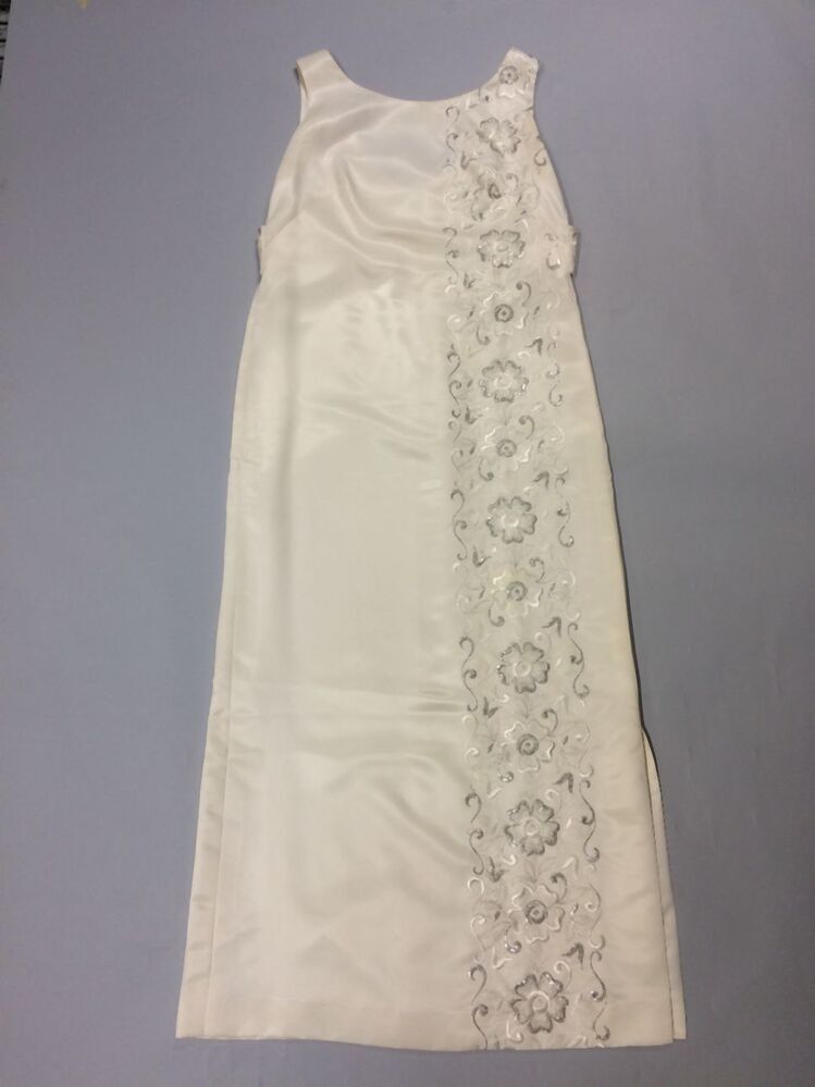 Lange avondjurk van gebroken wit satijn met borduursel in wit en zilver