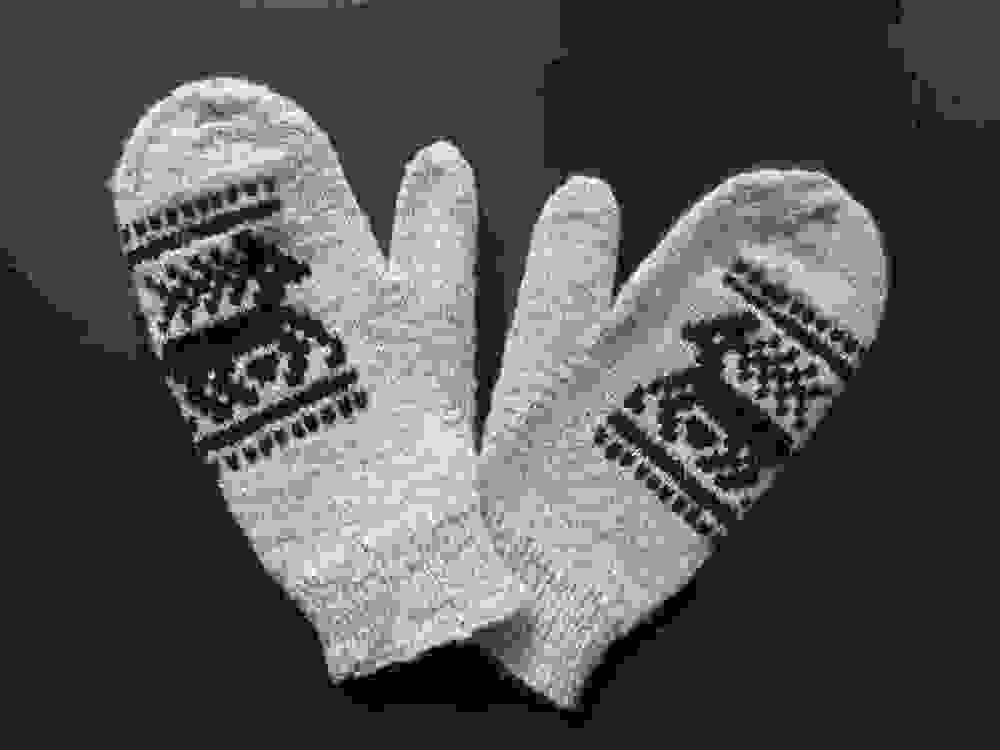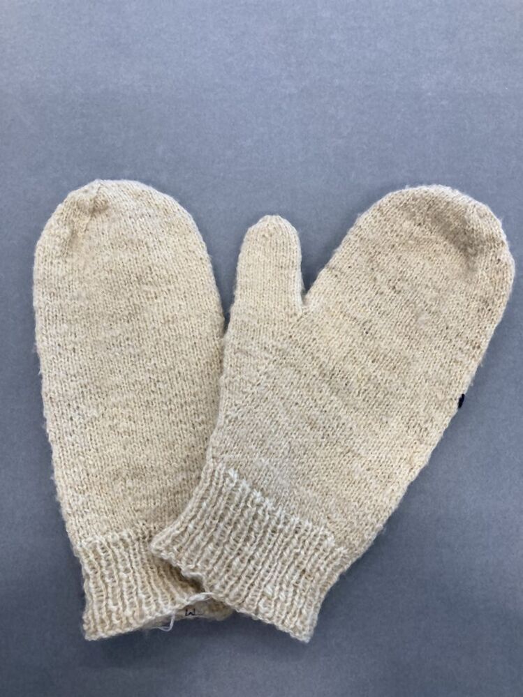 Paar wanten gebreid van ongeverfde zelfgesponnen schapenwol