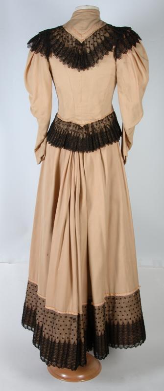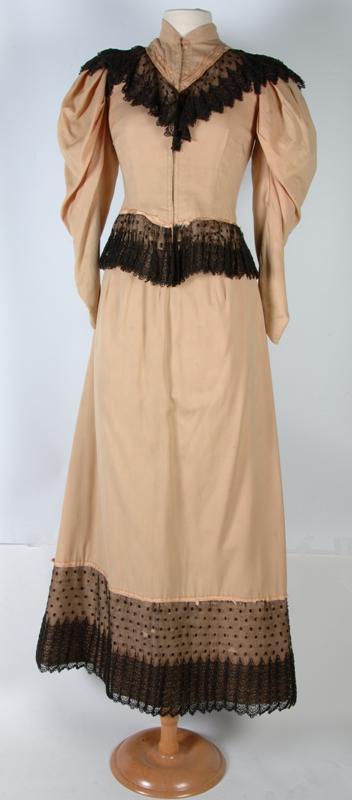 Getailleerd jak met grote pofmouw nauwsluitend bij de pols, onderdeel van crème wollen kostuum afgezet met zwart kant