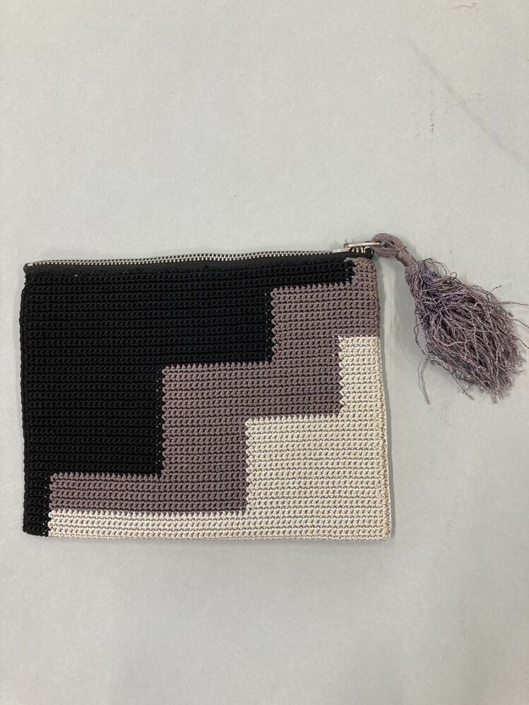 Gehaakte avondtas met rits, zwarte, grijs/beige en ecrú trapvormige vlakken