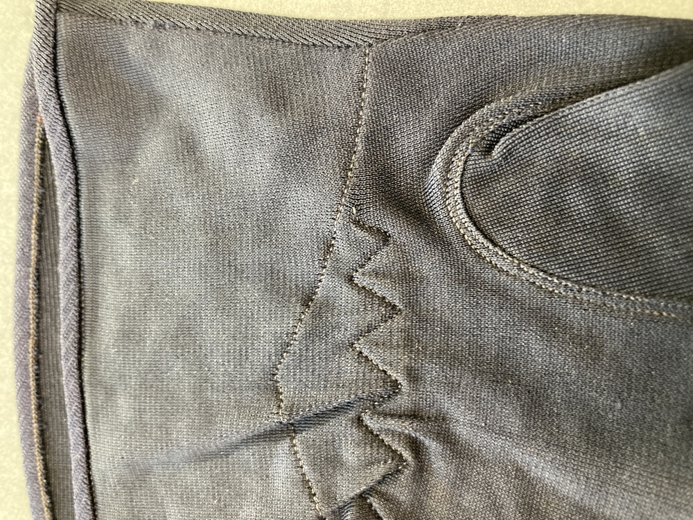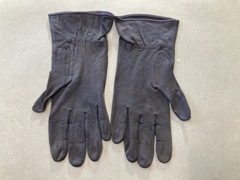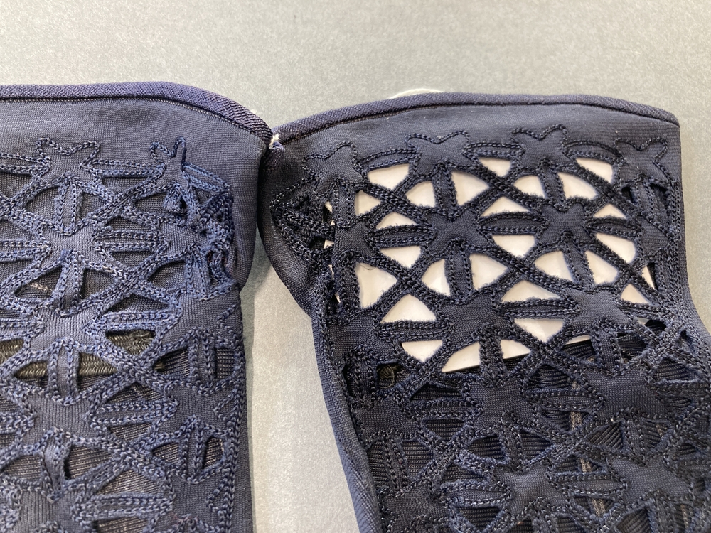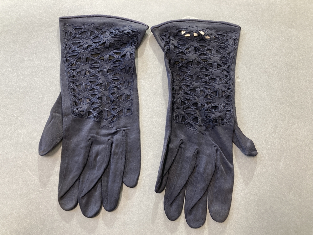 Paar donkerblauw katoenen handschoenen versierd met opengesneden, geometrisch patroon